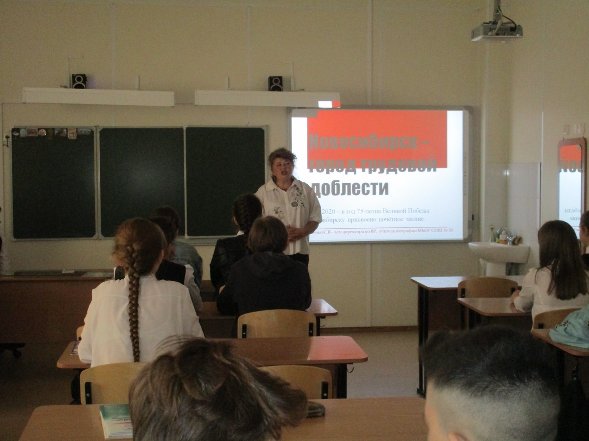 1 сентября для восьмиклассников МБОУ СОШ 23 руководитель филиала «Детская библиотека им. братьев Гримм» МКУК ЦБС Калининского района Ирина Незнамова подготовила и провела классный час «Новосибирск – город трудовой доблести и славы». В год 75-летия Великой Победы, 2 июля 2020 года, президент России Владимир Путин присвоил Новосибирску почётное государственное звание. Подростки увидели документальные кадры, кино- и фотодокументы, где большие свершения старшего поколения, повлияли на исторический процесс и авторитет нашей страны.
