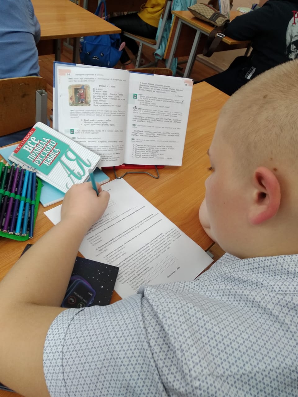 Для старших классов были проведены тесты. Материал взят из предложенных фондом «Родное слово» методических рекомендаций. Тесты позволили выявить самых грамотных учащихся в учебной параллели.