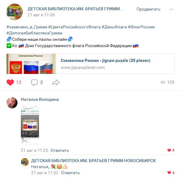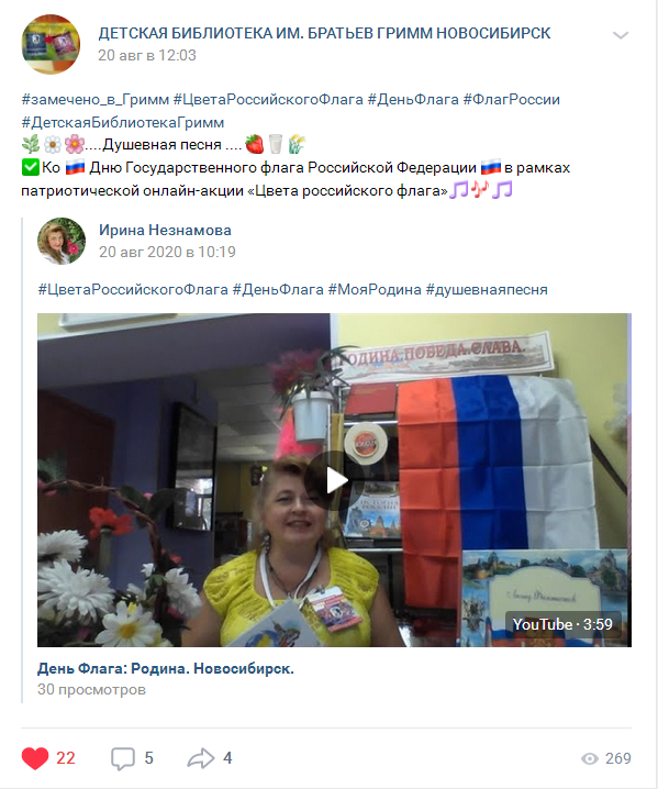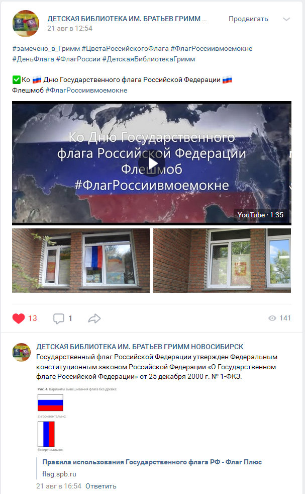 Ко Дню Государственного флага Российской Федерации пригласили всех желающих на патриотическую онлайн-акцию «Цвета российского флага» и Флешмоб #ФлагРоссиивмоемокне. Для участия в патриотической акции с 18.08.20 по 22.08.20 нужно было разместить свои фото и видеоматериалы со стихами, песнями, рисунками к празднику на странице Детской библиотеки им. братьев Гримм. На акцию принимались любые работы: рисунки, поделки, аппликации, стихи, сказки, фотографии, мультимедийные презентации, проведение флешмобов, посвящённые Государственному флагу РФ с хештегами #ЦветаРоссийскогоФлага #ДеньФлага.
