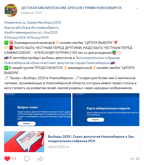 С июля про сентябрь 2020 года для более старшей возрастной категории пользователей в группе библиотеки в ВК проходил еженедельный правовой онлайн-ликбез «Цитата выбора» в программе которого были: опросы, интервью с кандидатами, конкурсы, видео-сюжеты, цитаты великих, информационные обзоры, цифры, факты, комментарии и другое с хештегами #замечено_в_Гримм, #выборы2020, #цитатаВыбора, #хотимвыбирать, #работаемнарезультат_Нск2020, #16округНСК #25округНСК.