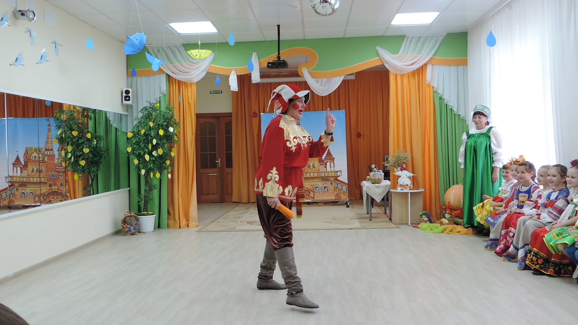 В гости к детям пришли сказочные герои: красавица Осень, добродушный Зайка, хитрая Лисица и веселый Пугало, русские красавицы и Петрушка. Дети принимали активное участие во всех номерах праздника: выразительно читали стихи, задорно танцевали, эмоционально исполняли песни, играли. Дети были в восторге, так как продумано было все до мелочей: замечательные сценарии, праздничная атмосфера, красота оформления музыкального зала, парадность в одежде взрослых и детей, особый эмоциональный настрой коллектива. Ярким и запоминающимся эпизодом в младших группах стал сюрпризный момент – яблоки в корзине под волшебным платком, которые в подарок принесла Осень. Взрыв хохота у старших ребят вызвали музыкальные червячки, появившиеся из большого бутафорского яблока! А до чего был красив и вкусен праздничный пирог-Богач!
