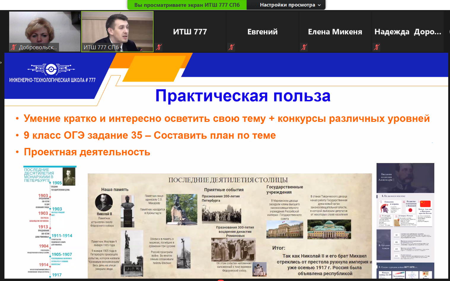 В прошедшем 1 декабря вебинаре «Учебные задания, развивающие инженерные компетенции школьников на уроках истории и обществознания» приняла участие Добровольская И.В., учитель истории, которая представила сообществу тему «История на ощупь, или значение макетирования в изучении исторических достопримечательностей». Участниками вебинара (89 человек) также были отмечены выступления педагогов из МБОУ «Лицей № 35 – образовательный центр «Галактика» Приволжского района г. Казани, ГБОУ лицея № 144 Санкт-Петербурга, ГБОУ «ИТШ № 777» Санкт-Петербурга.