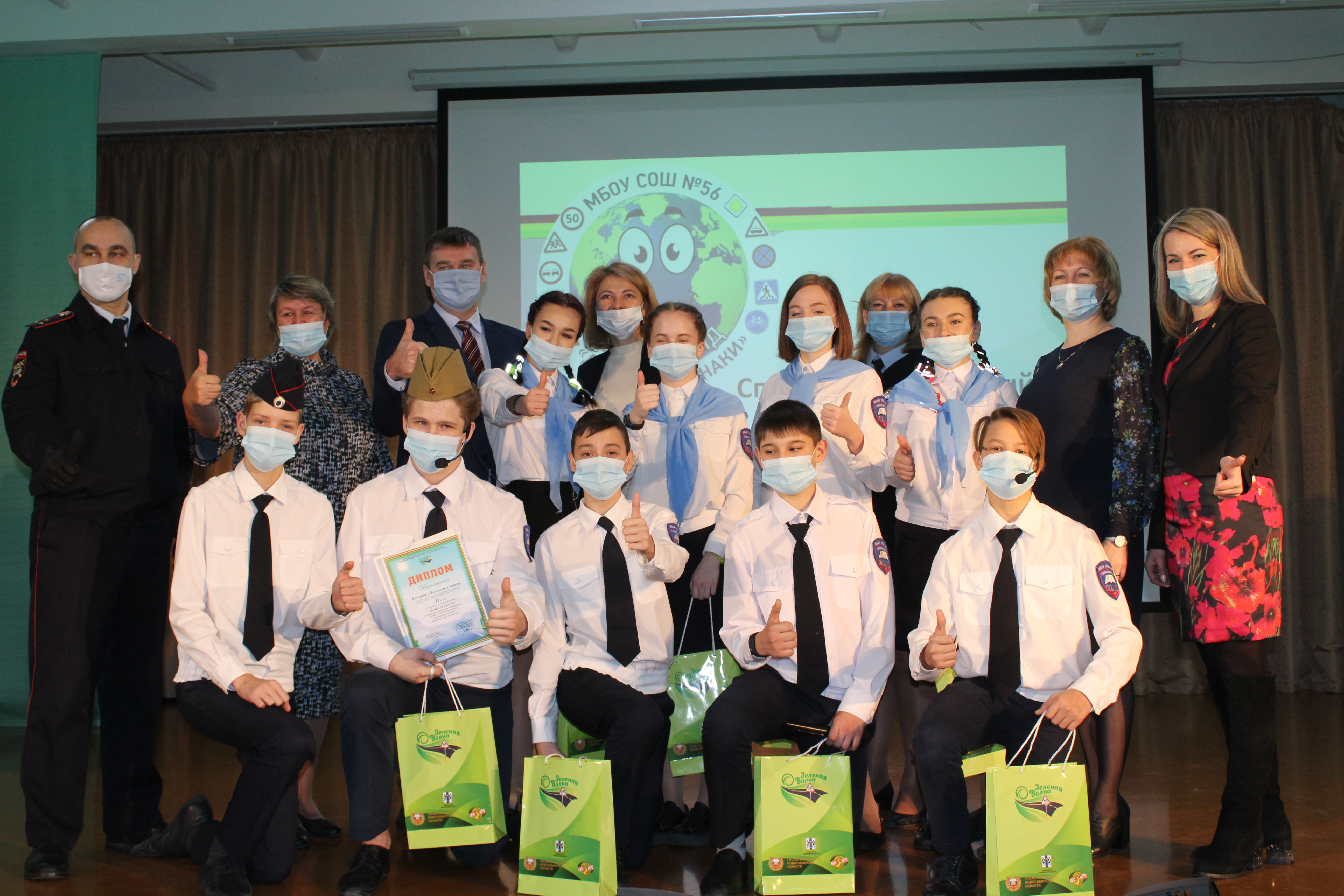 Присутствующие гости дали высокую оценку деятельности специализированного класса инспекторов дорожного движения МБОУ СОШ № 56 под руководством Ольги Михайловны Портновой. Организаторы конкурса выразили сожаление о том, что из-за сложившейся неблагоприятной санитарно-эпидемиологической обстановки изменился формат подведения итогов Областного детского конкурса – фестиваля «Зеленая волна». Однако они нашли возможность поздравить агитбригаду «Дорожные знаки» с соблюдением санитарно-эпидемиологических требований.
