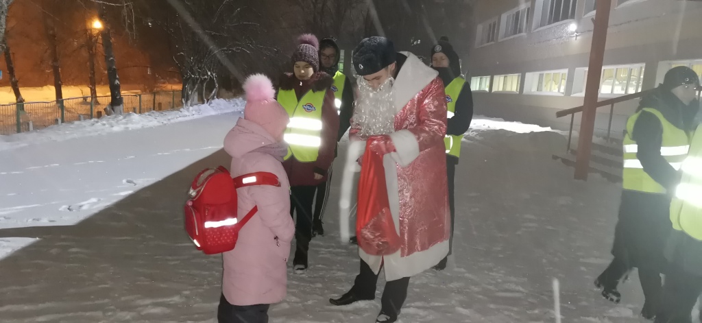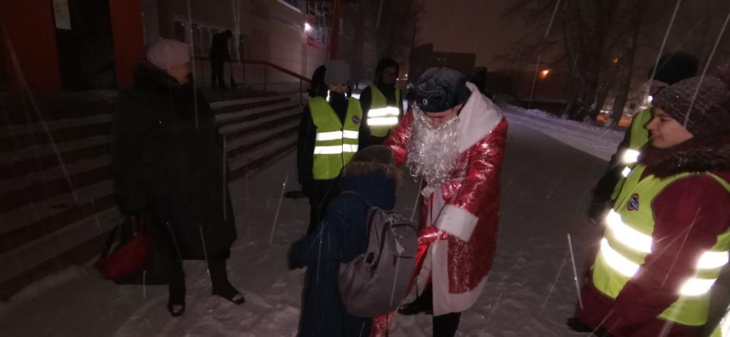 Данная акция прошла с участием полицейского Деда Мороза и была направлена на предупреждение аварийности с участием детей и пропаганду использования световозвращающих элементов школьниками.
