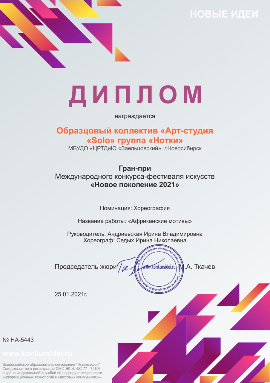 Образцовый коллектив Арт-студия «Solo» ЦРТДиЮ «Заельцовский» получил диплом Гран-при международного онлайн-конкурса-фестиваля искусств «Новое поколение 2021».