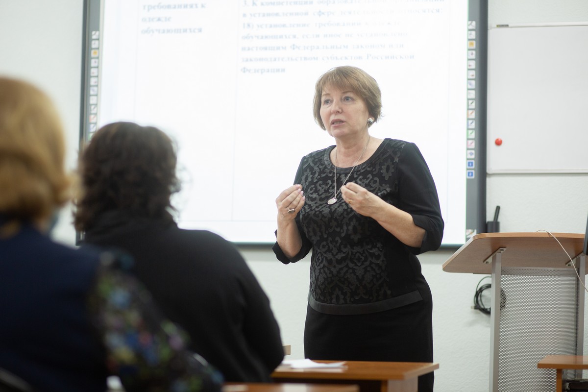 Практико-ориентированный семинар на тему «Управление образовательной организацией в соответствие с требованиями законодательства» провела Ольга Филипповна Сысалова, заместитель директора по мониторингу качества образования МКУДПО «ГЦРО». Локальные акты образовательной организации: требования к структуре, содержанию и порядку разработки; порядок приёма в образовательные организации, правила оказания платных услуг, требования к лицензированию образовательной деятельности, обеспечение функционирования внутренней системы оценки качества образования, организация обучения по основным и дополнительным общеобразовательным программам, требования к проведению государственной итоговой аттестации – эти и другие вопросы были рассмотрены в ходе занятия.