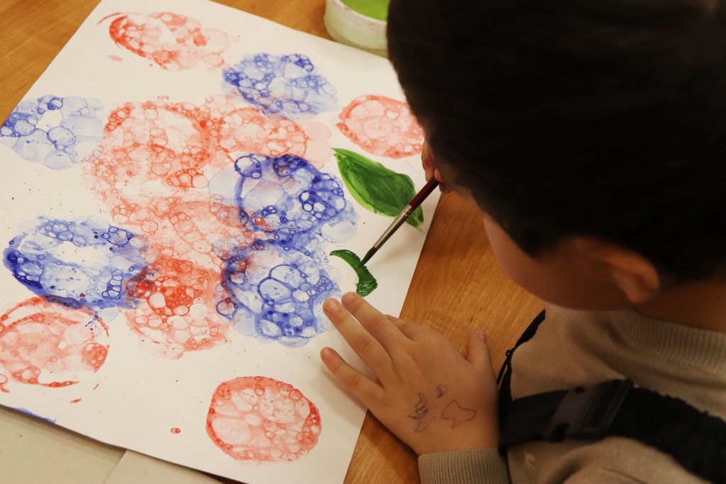 На мастер-классе ребята узнали, что современные изотехники позволяют создавать картины с помощью самых неожиданных материалов: кофе, чая, фольги, фруктов, и даже мыльных пузырей, а для приготовления «краски» нужны только гуашь, жидкое мыло и вода. В нетрадиционной технике «рисование мыльными пузырями» ребята нарисовали удивительные картины «Цветы для мамы». Картины получились самые разнообразные и были подарены мамочкам в преддверии Международного женского дня.