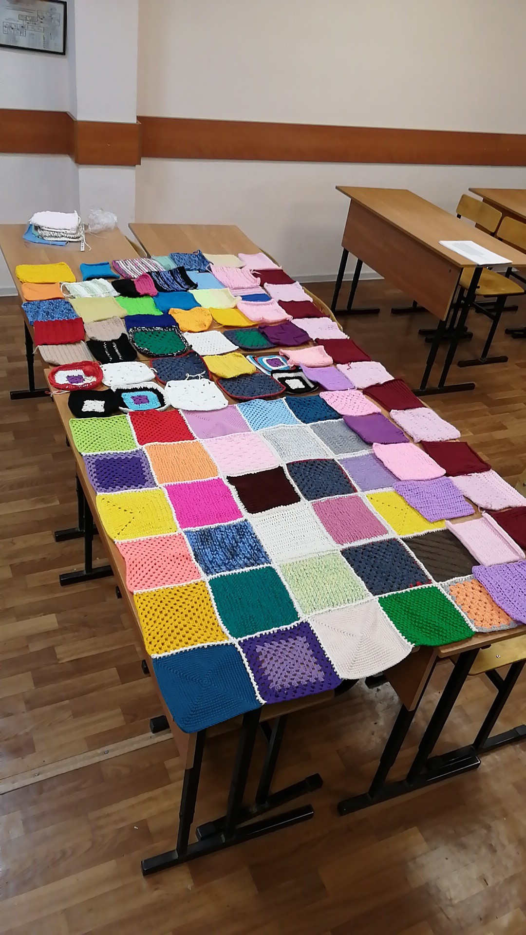 Узнав о том, что рамках благотворительного марафона «Добрый Новосибирск» проходит акция «Душевное тепло», в ходе которой совместными усилиями создаются пледы для пожилых людей, мы решили присоединиться к ней. Идея создать мастерскую на переменах предполагала единение педагогов, ребят и родителей в одном добром деле. Как и всегда все новое начинается с инициативной группы, в которую вошли ребята и педагоги лицея. С 27 февраля была организована зона для вязания: диваны, мотки пряжи, спицы, крючки. В роли тьюторов выступили опытные вязальщицы. Все желающие во время перемен и дома вязали квадраты 15х15 см, из которых было собрано полотно пледа. Самыми активными участниками акции стали обучающиеся 6 «Г», 8 «Г», 6 «Б» классов, родители обучающихся 2 «Г» класса.