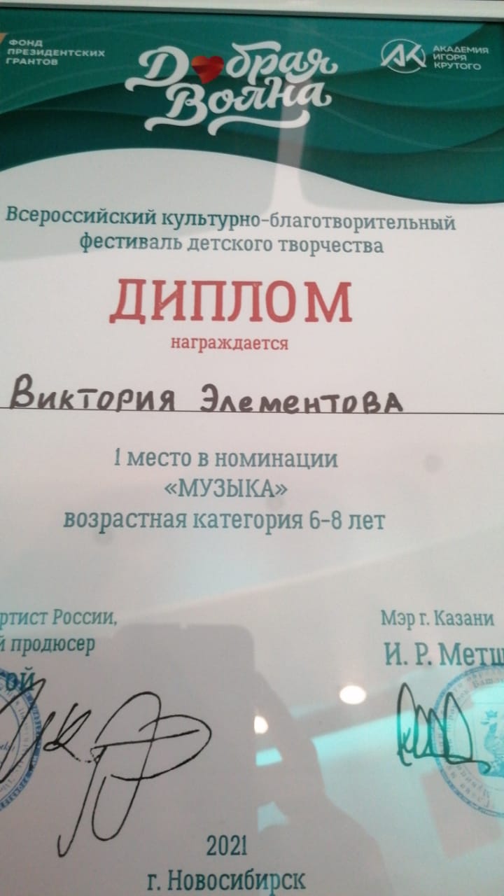 Элементова Вика не только выступила на Гала-концерте, но и стала обладательницей 1 места и была награждена поездкой на Финал и Гала-концерт Фестиваля «Добрая волна», который состоится в Казани в ноябре 2021 года! Поздравляем талантливую звездочку и желаем успеха в творческих начинаниях!