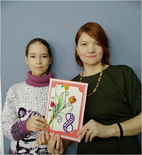 - Семья Дмитриевых (Дмитриева Юлия Игоревна, Дмитриева Мария), работа «Мастер-класс по изготовлению открытки, посвященной Международному дню 8 марта», Краснодарский край, Тихорецкий район, поселок Парковый, Муниципальное бюджетное учреждение дополнительного образования центр внешкольной работы поселка Паркового муниципального образования Тихорецкий район, педагог Смольникова Оксана Владимировна;
