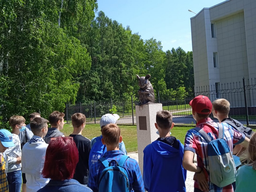 Заведующий музеем истории генетики в Сибири Синицын Иван Александрович представил участникам профильной смены экспозицию музея под открытым небом с памятником лабораторной мыши и памятником академику Дмитрию Константиновичу Беляеву.