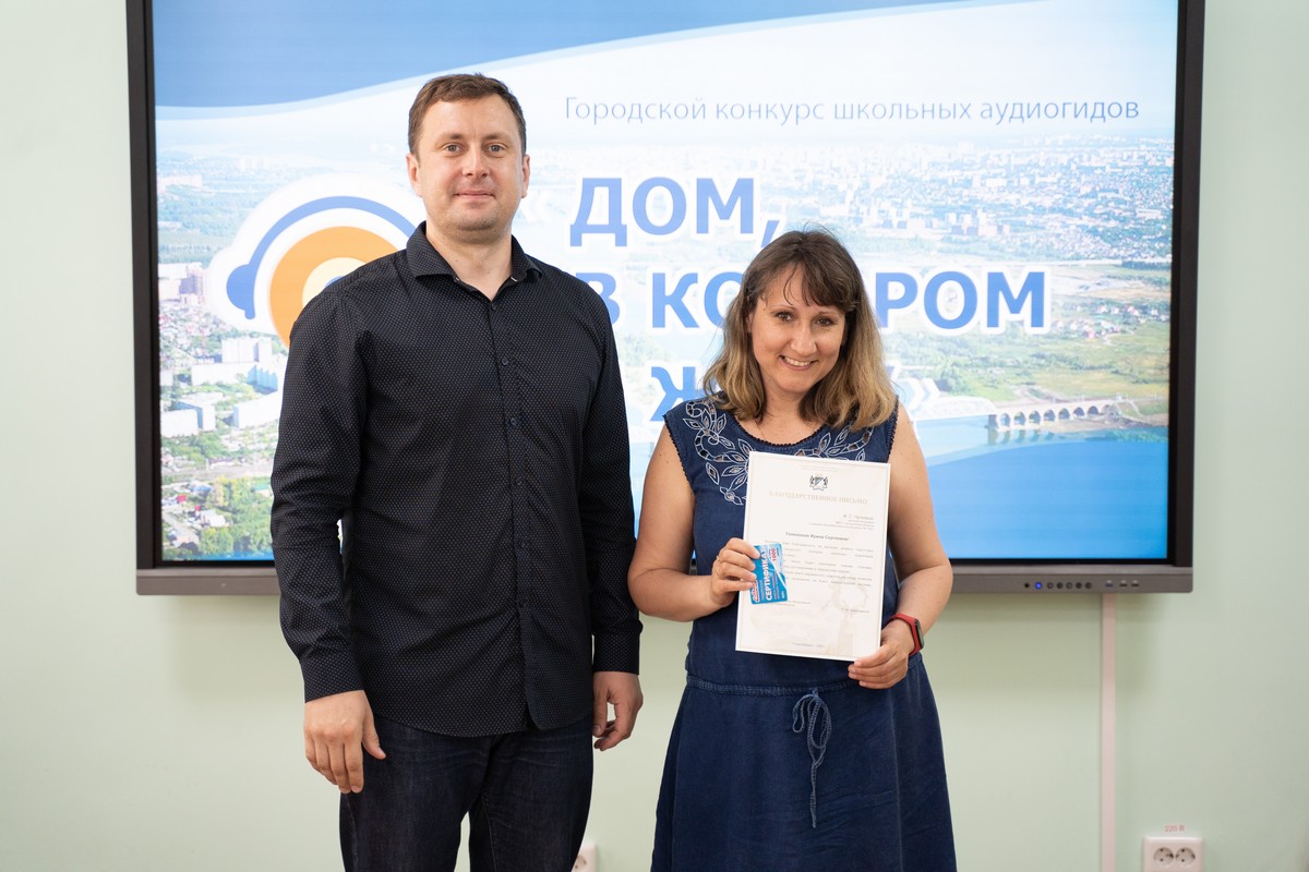 Особые слова признательности были сказаны педагогам за активное участие и высокий уровень подготовки школьников в конкурсе школьных аудиогидов «Дом, в котором я живу». Они были награждены Благодарственными письмами департамента образования мэрии города Новосибирска и памятными призами, которые им вручил директор Городского центра информатизации «Эгида» Сюзяев Роман Юрьевич.