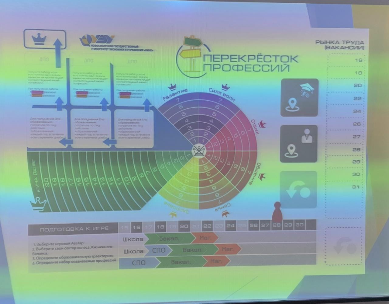 В игре принимали участие команды по шесть игроков, которые создавали аватар – 14-летнего парня или девушку – и «проживали» его жизнь с 15 до 31 года. В процессе игры аватар выбирает профессии, абитуриенты же узнают, какие специальности есть в НГУЭУ, и с помощью какой стратегии можно заработать больше денег в той или иной сфере деятельности без ущерба для себя.