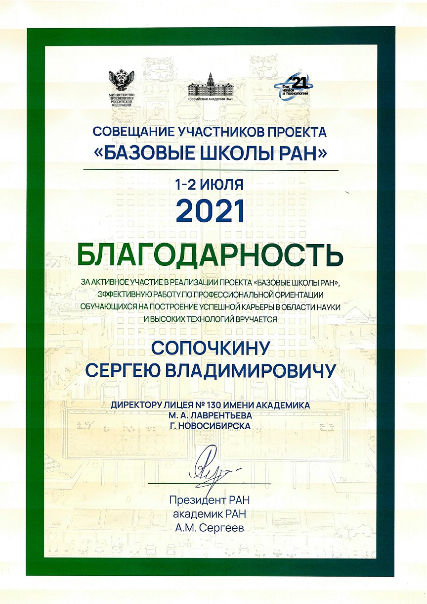 По итогам работы Сергею Владимировичу Сопочкину вручено Благодарственное письмо Президиума Российской Академии наук. Благодарность от Президента РАН – заслуга всего лицейского сообщества: и тех, кто работал и учился в школе ранее, и тех, кто развивает наукоёмкое образование сейчас.