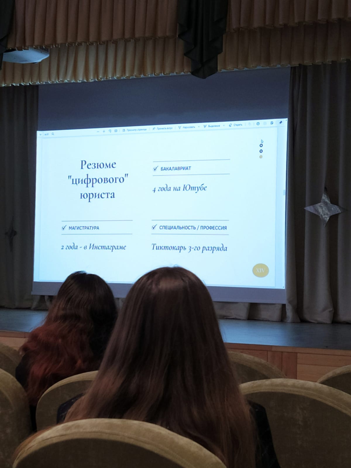 С учащимися 10А и 11А классов были проведены лекции о будущем юридической профессии, великих юристах прошлого и настоящего, рассмотрены мнения о «скандальных» юристах, о возможных перспективах юристов в «цифре». Учащиеся узнали о том, как лучше составить резюме цифрового юриста, были проанализированы потребности цифрового юридического рынка. Кроме того, учащиеся 7И класса познакомились с азами тайм-менеджмента, активно участвующими в проектной деятельности.
