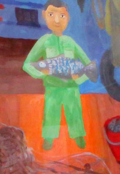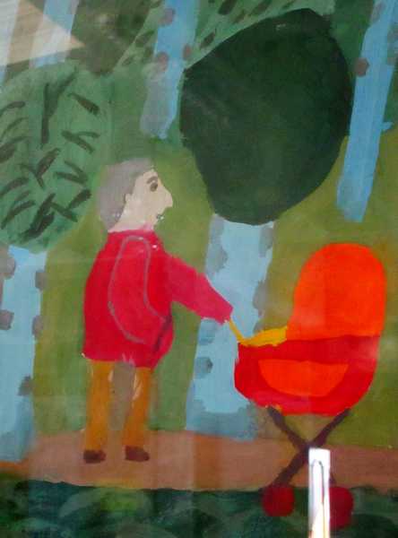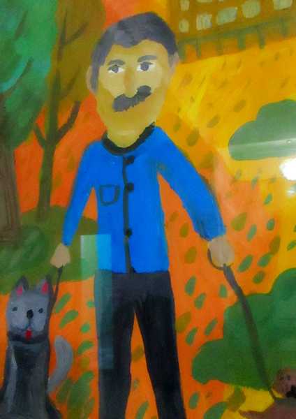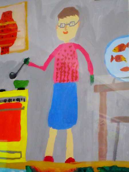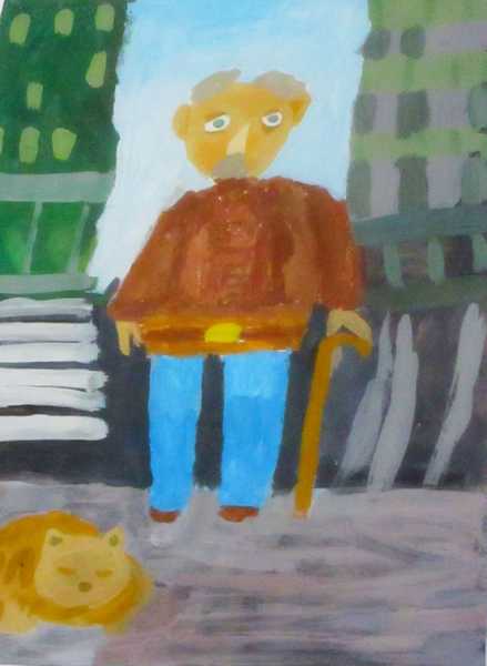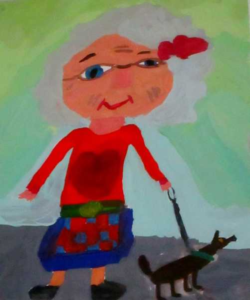 Действительно, перед нами портреты дедушек, гуляющих с внуками, с собачками, сидящих за компьютером в наушниках и демонстрирующих богатый улов. На рисунке «Одиночество» – грустный интеллигентный дедушка, идущий с палочкой среди многоэтажек. У плиты за важным для всей семьи делом хлопочет «Бабушка-хозяйка», а «Модная бабушка» в шляпке с красным пером прогуливает маленькую собачку. Рисунки детей передают их отношение к родным и близким, отражают интересы и заботы.