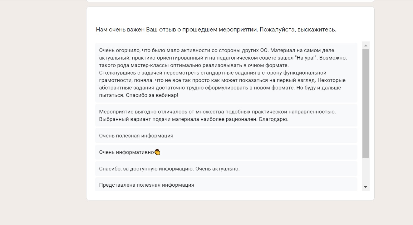Вебинар получил благодарные отзывы участников. Региональный ресурсный центр развития образования «КЛИК» будет продолжать работу по обучению педагогов актуальным приёмам формирования и развития функциональной грамотности обучающихся.