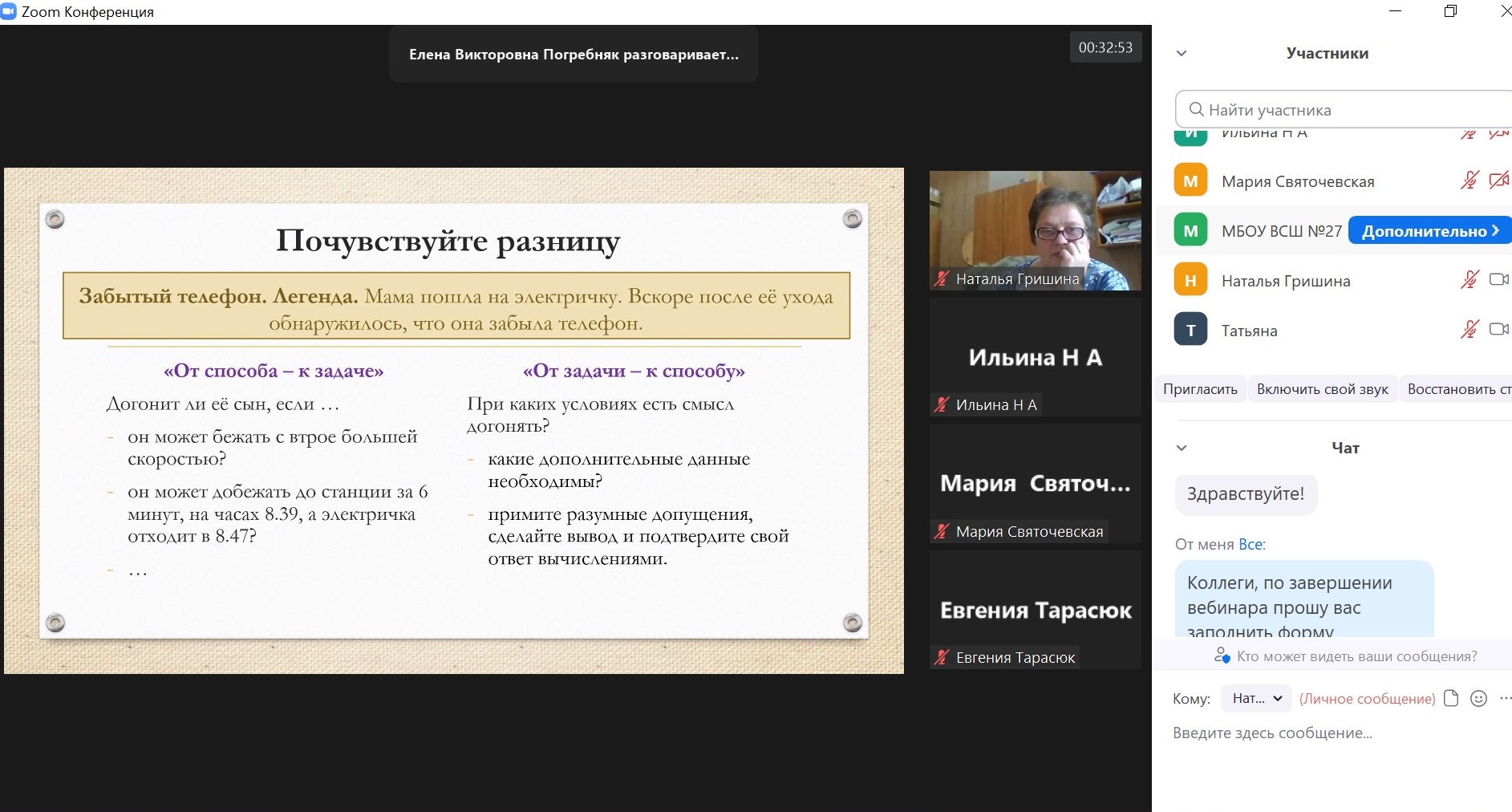 В пятницу 19 ноября руководители лабораторий центра, представители подшефных образовательных организаций (как из города, так и из области) и приглашённые коллеги из школ Калининского района стали участниками деятельностного вебинара «Функциональная грамотность обучающихся: как это делать». Каковы особенности заданий, направленных на развитие функциональной грамотности? В чём их отличие от традиционных учебных задач, проверяющих знаниевый уровень освоения образовательной программы? На эти вопросы ответила Елена Викторовна Погребняк, к.п.н., доцент кафедры начального образования Новосибирского института повышения квалификации и переподготовки работников образования.