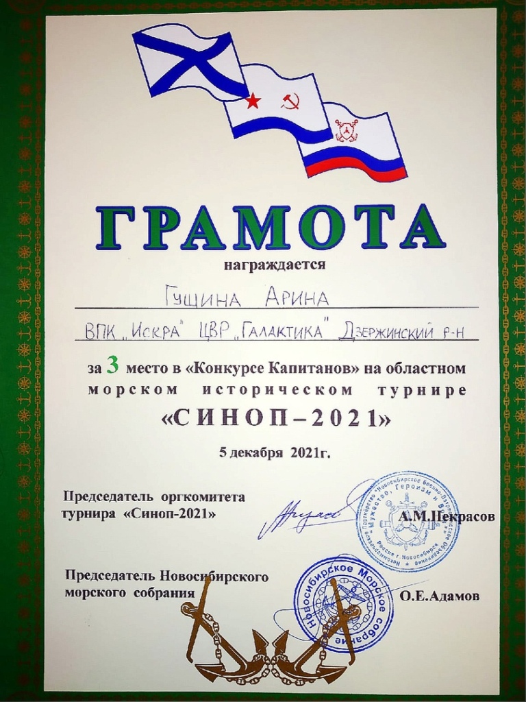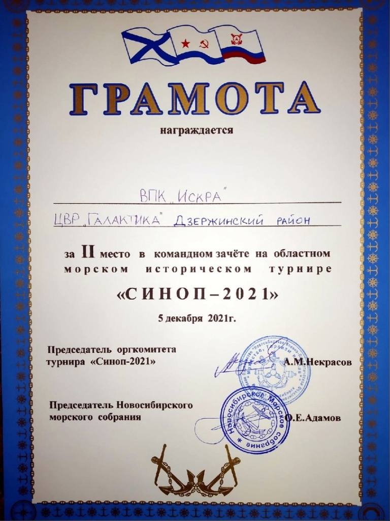 Турнир традиционно состоял из трёх частей: ответы на вопросы по истории флота, значимым событиям и известным людям определённого исторического периода; решение тематического кроссворда; конкурс капитанов. В турнире принимали участие команды клубов морской направленности, курсанты Сибирского кадетского корпуса и курсанты Новосибирского командного речного училища имени Дежнева.  По итогам трёх конкурсов команда ВПК «Искра» заняла почётное 2 место, а старший матрос Гущина Арина – 3 место в конкурсе капитанов. Библиотека нашего клуба пополнилась двумя замечательными энциклопедиями.