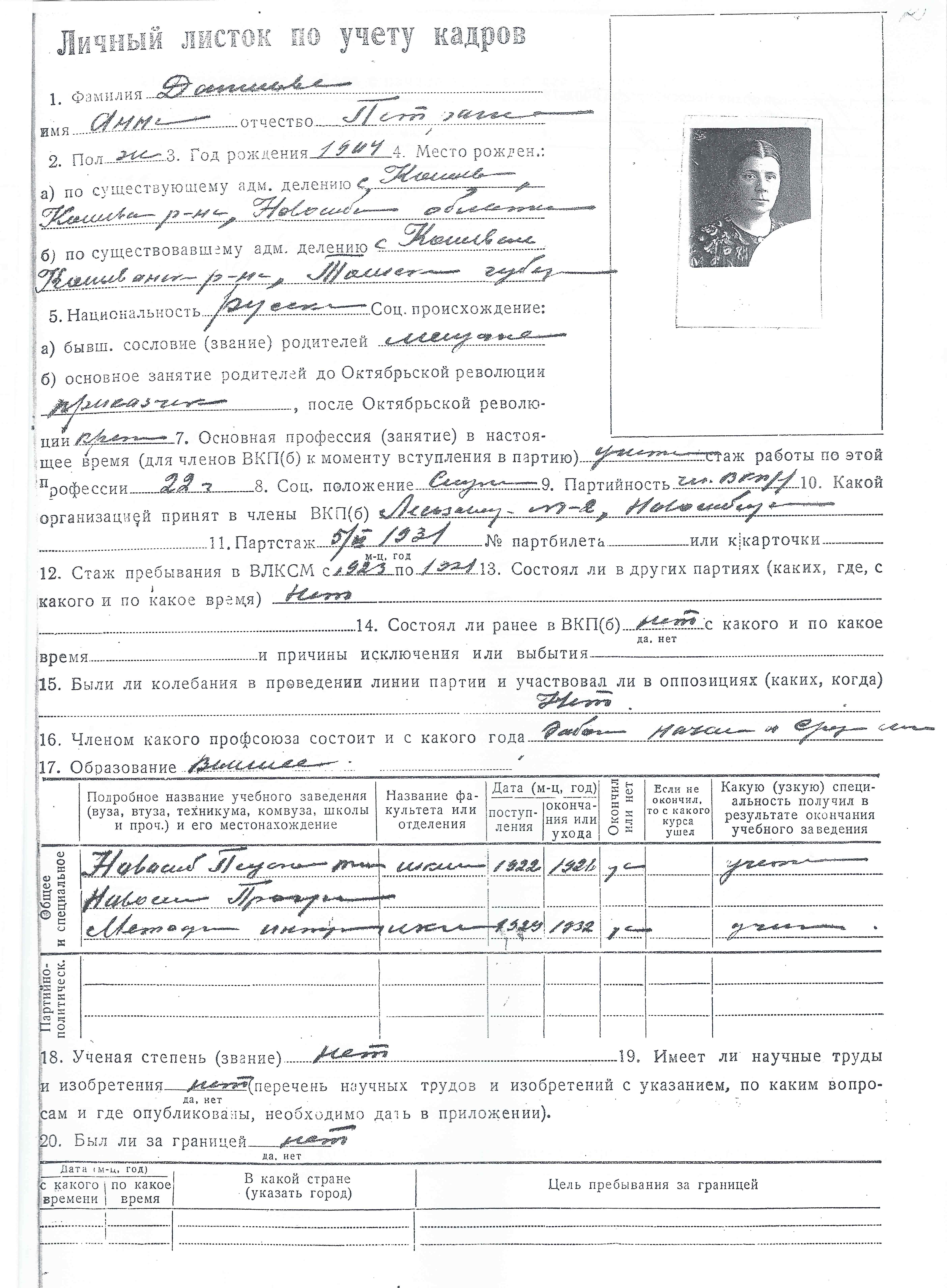 Вот краткая выписка из характеристики на члена ВКП(б) Данилову Анну Петровну: «Тов. Данилова А. П. на руководящей педагогической работе с 1926 года. Дисциплинирована, инициативна. На практической руководящей работе показала хорошие организаторские способности. Активно участвует в партийной и общественной жизни».