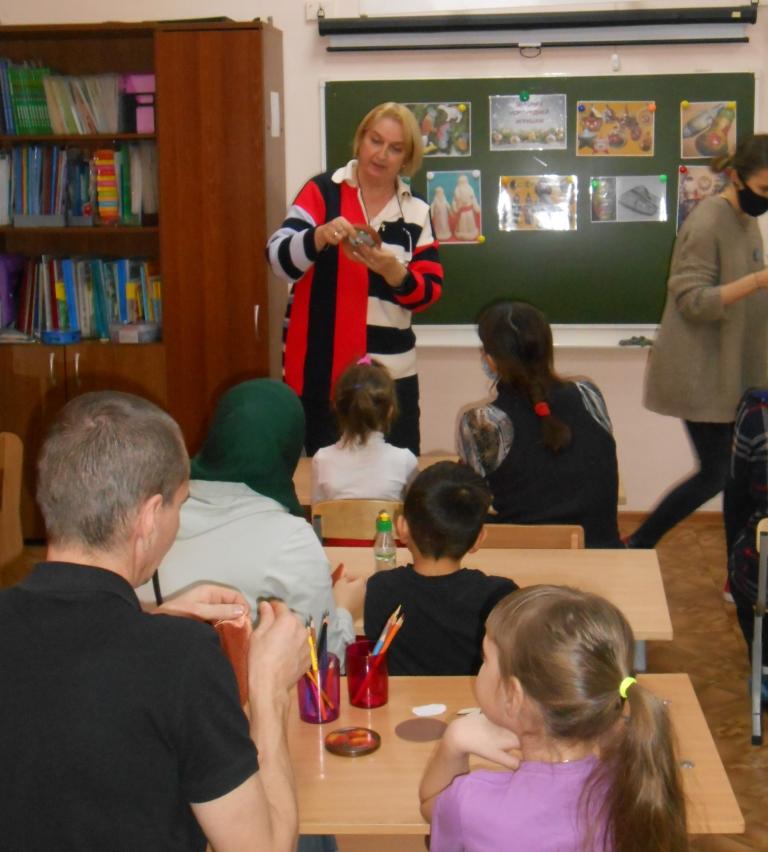 В начале мастер-класса Ирина Владимировна рассказала историю создания новогодней игрушки, празднования Нового года в России при Петре I. Участники мероприятия узнали, когда впервые украсили новогоднюю ёлку, какие игрушки были у царских детей. Особое внимание детей и родителей привлекли очень скромные, но дорогие сердцу игрушки военных лет, сделанные из лампочек и обклеенные портерами героев войны, вырезанные из газет того времени.