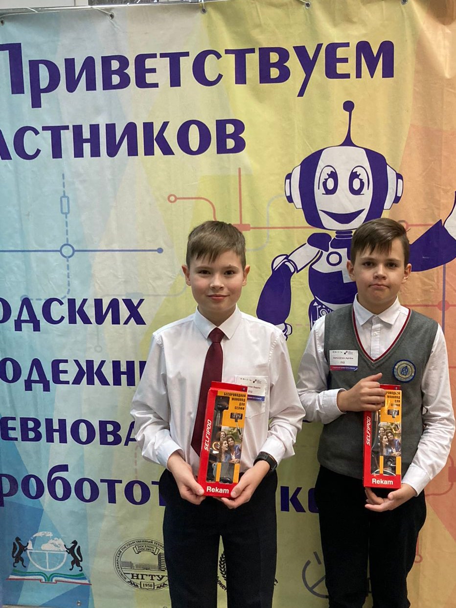 – Усатов Лев (2В класс) и Усатов Егор (4А класс) – робототехническая Олимпиада «Заснеженная дорога» (младшая возрастная категория);