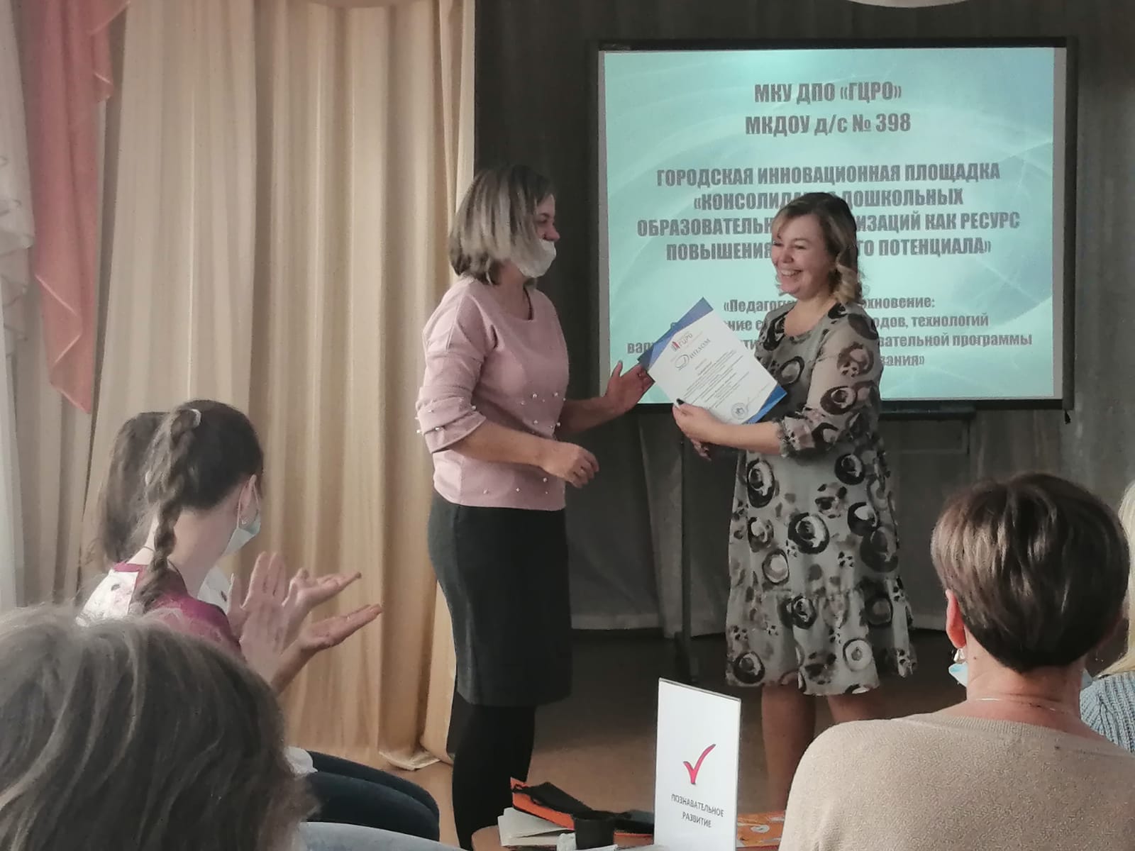 19 января на базе МКДОУ д/с № 398 прошло награждение по итогам городского конкурса «Педагогическое вдохновение». Конкурс проводился при поддержке МКУ ДПО «ГЦРО» с 1 по 30 декабря 2021 года в рамках Городской инновационной площадки «Консолидация дошкольных образовательных организаций как ресурс повышения кадрового потенциала». На конкурс принимались методические разработки педагогов, отражающие содержание вариативной части основных образовательных программ ДОО – участников ГИП. Победителями в десяти заявленных номинациях стали педагоги МКДОУ д/с № 22, МКДОУ д/с № 123, МКДОУ д/с № 242, МКДОУ д/с № 333, МКДОУ д/с № 357, МКДОУ д/с № 398 города Новосибирска.
