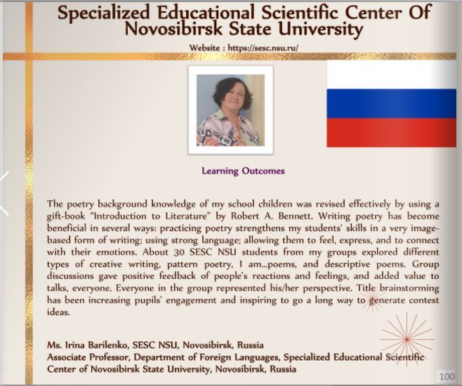 В международный сборник вошли работы учеников СУНЦ НГУ Никиты Свидетелева, Марии Шуба, Тумэна Базарова, Дмитрия Майтака, Екатерины Карабут, Игоря Бетке. Никита и Тумэн также сняли ролики, в которых прочитали свои стихи. Эти ролики вошли в видеопрезентацию проекта.