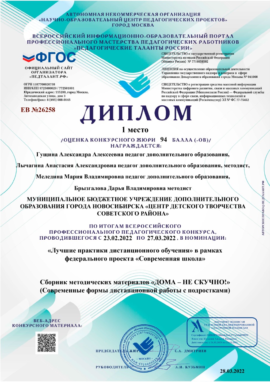 В этом году методические материалы педагогов ЦДТ Советского района приняли участие во Всероссийском профессиональном педагогическом конкурсе в номинации «Лучшая практика дистанционного обучения» на портале «Педагогические таланты России» и XIII Открытом межрегиональном конкурсе методических материалов «Секрет успеха».
