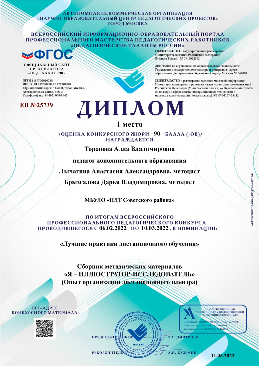 Сборник методических материалов «Я – иллюстратор-исследователь» (Опыт организации дистанционного пленэра) получил диплом Лауреата в номинации «Цифровая среда – траектория развития». Поздравляем А. В. Торопову, А. А. Лычагину, Д. В. Брызгалову!