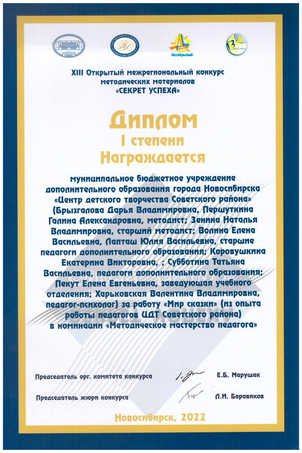 Сборник «Мир сказки» (из опыта работы педагогов ЦДТ Советского района) награжден дипломом I степени в номинации «Методическое мастерство педагога». Поздравляем Д. В. Брызгалову, Г. А. Першуткину, Н. В. Зенину, Е. В. Волину, Ю. В. Лапташ, Е. В. Коровушкину, Т. В. Субботину, Е. Е. Пекут, В. В. Харьковскую!