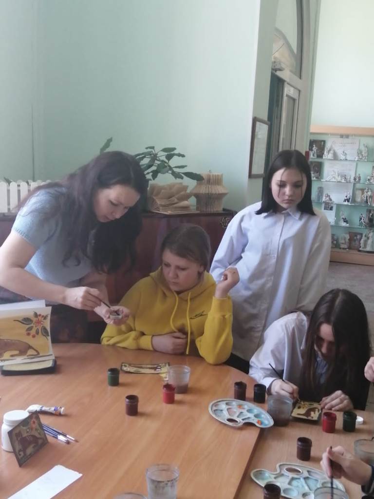 Дети с интересом прослушали рассказ сотрудника библиотеки и посмотрели фильмы о русских народных промыслах. После небольшой экскурсии по залу библиотеки, где были представлены экспонаты и книги различных русских промыслов, ребята приняли участие в мастер-классах.