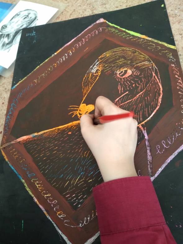 Затем наносится рисунок. Ребёнку рекомендуется предварительно нарисовать карандашом то, что он хочет процарапывать. Такой подготовительный рисунок у художников называется «картон». Егор выполнял работу по фотографии. Он готовил подарок своему дяде, у которого есть собака-такса.