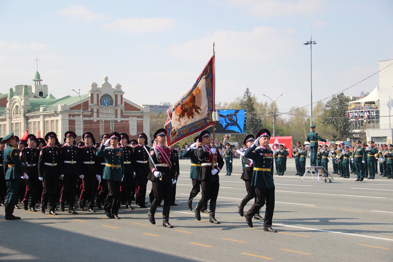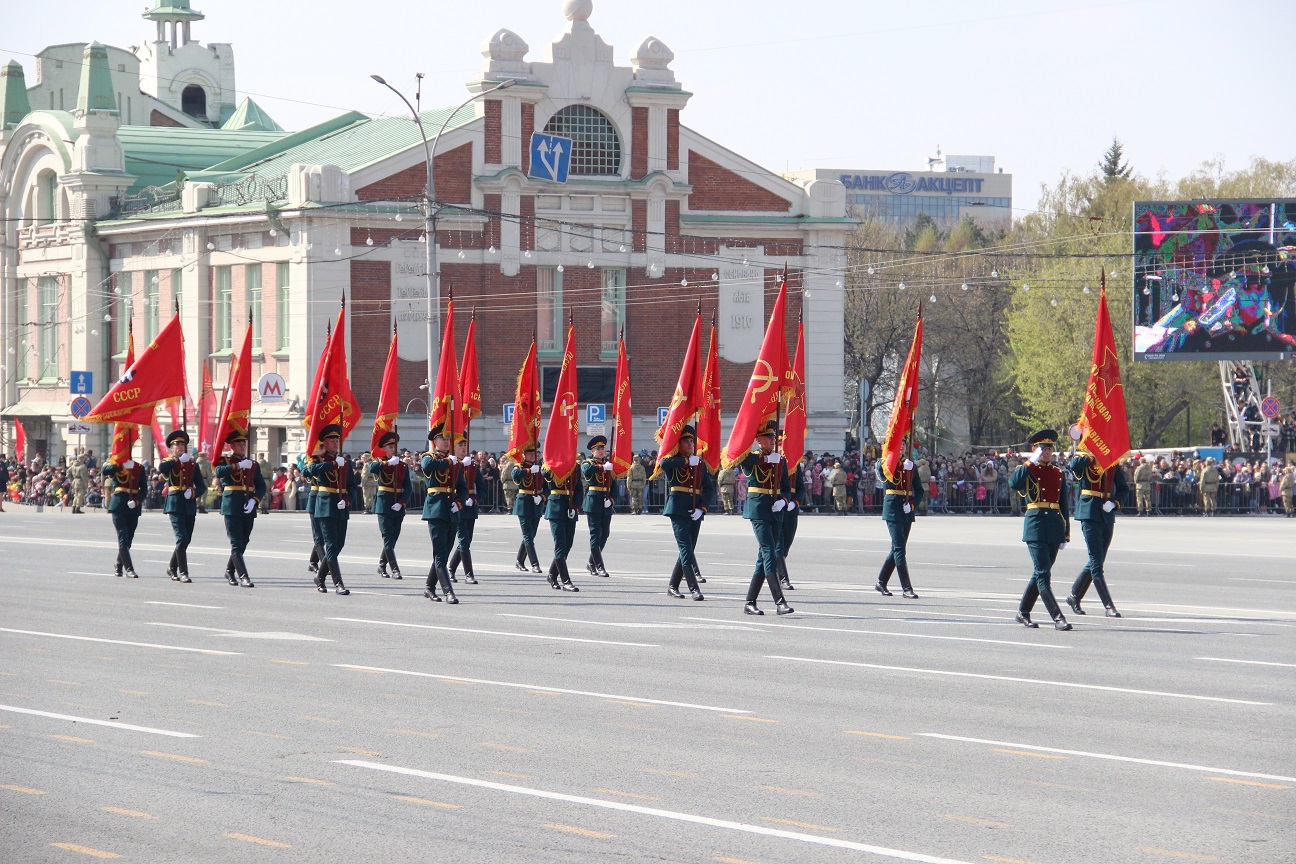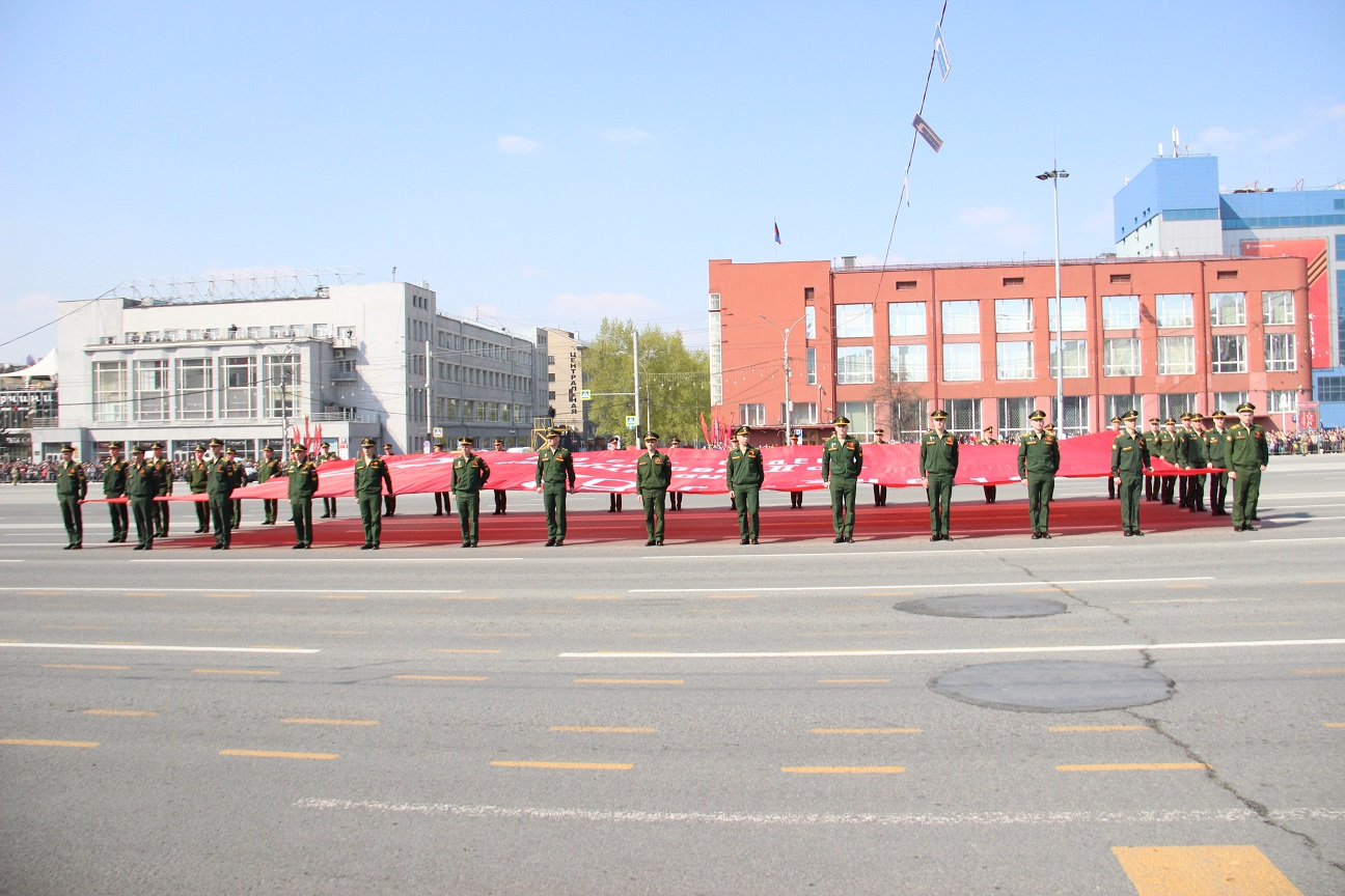В завершение парада по площади Ленина пронесли знамя Победы, полотнище «Новосибирск – город трудовой доблести», флаги советских республик, которые символизируют единство народа в борьбе с фашизмом.