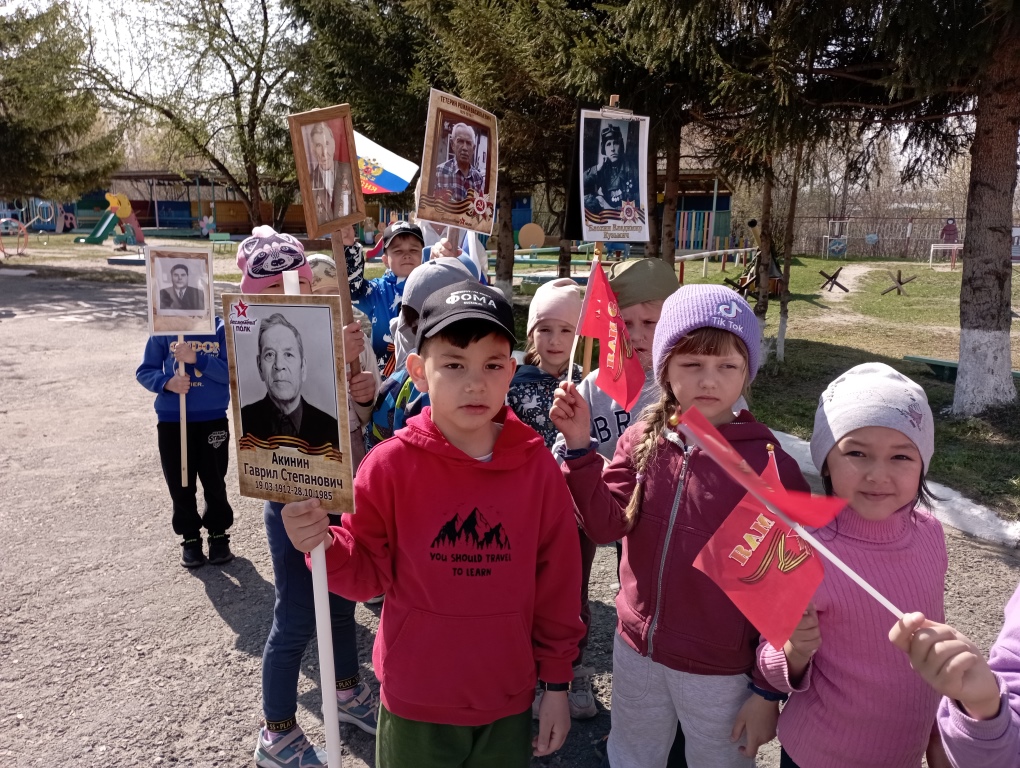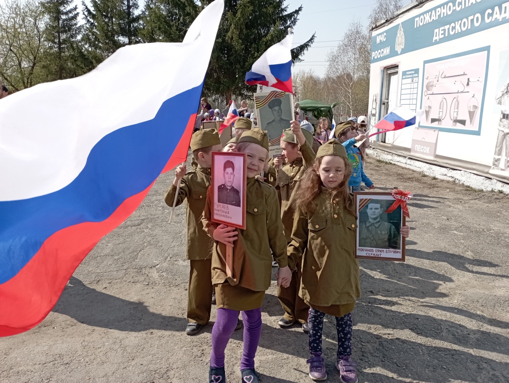 К шествию «Бессмертного полка» по территории дошкольного учреждения присоединились целые семьи. После прохождения колонны ребята пригласили родителей в мобильный музей, где со знанием рассказали о событиях и предметах, которые принесли Победу.