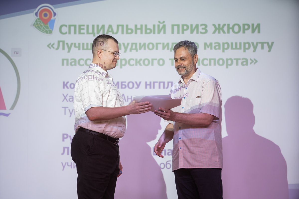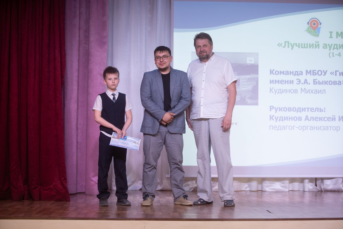 В каждой номинации в трех возрастных группах (1-4, 5-8, 9-11 классы) были определены победители. 1 место среди учащихся начальной школы занял Михаил Кудинов, ученик 2 класса гимназии № 13 имени Э.А. Быкова, вместе со своим папой – известным тележурналистом Алексеем Кудиновым. Алексей отметил, что работать вместе с сыном было очень интересно, потому что детский взгляд на известные вещи порой бывает очень необычным. Их аудиогид называется «Между кладбищем и ипподромом». Он предлагает познакомиться с творчеством художника-монументалиста Василия Кирьянова, посмотреть, где во время Великой Отечественной войны лечили раненых, узнать, как кладбище превратилось в один из лучших парков города, выяснить, где располагался первый ипподром и прогуляться по части улицы Пушкина.
