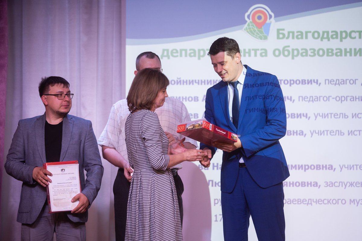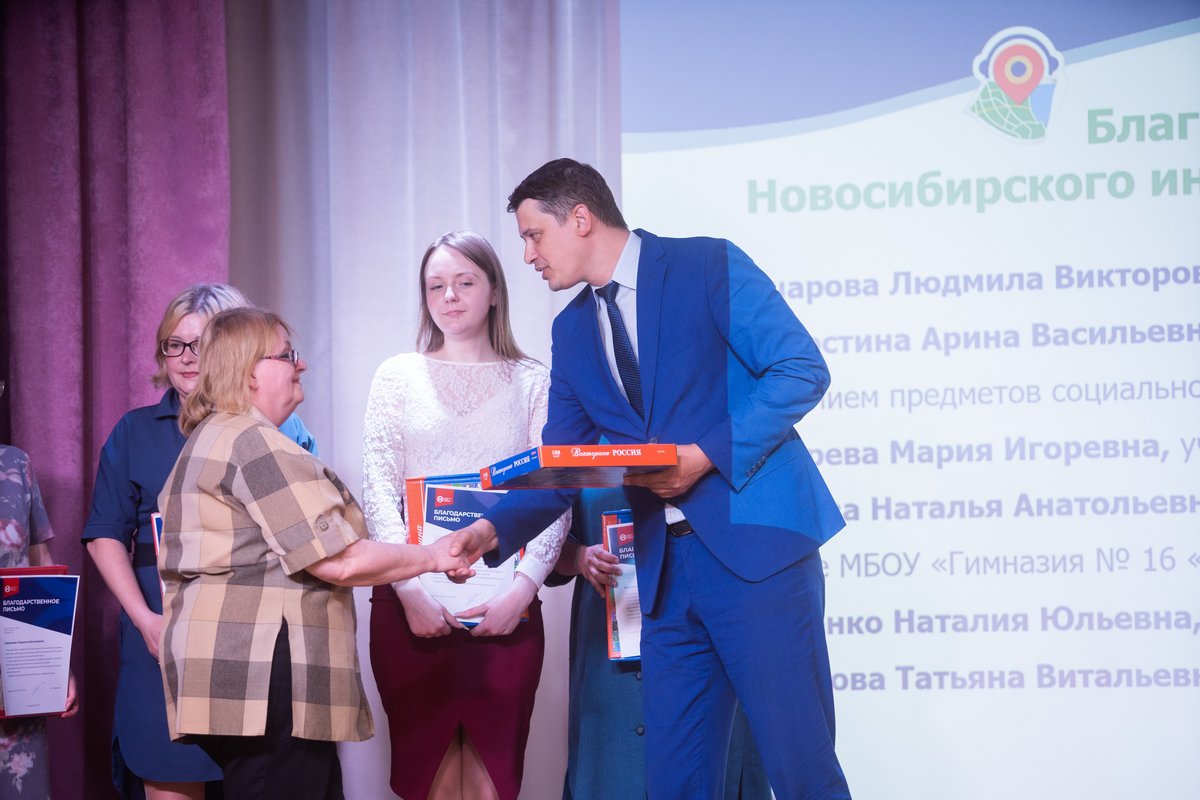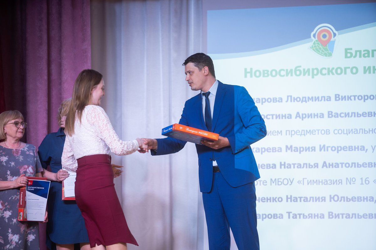 За активное участие и высокий уровень подготовки школьников они были награждены Благодарственными письмами департамента образования мэрии города Новосибирска и Новосибирского института современного образования, которые им вручил директор института Максим Евгеньевич Давыдов. Он отметил, что «очень важен исторический контекст, в котором мы живем. Понять и принять его можно, только изучая историю родного города, получая подпитку от свершений наших предков. В этом смысле аудиогиды, выполненные ребятами под руководством педагогов, – это патриотизм в действии, преемственность между поколениями новосибирцев».