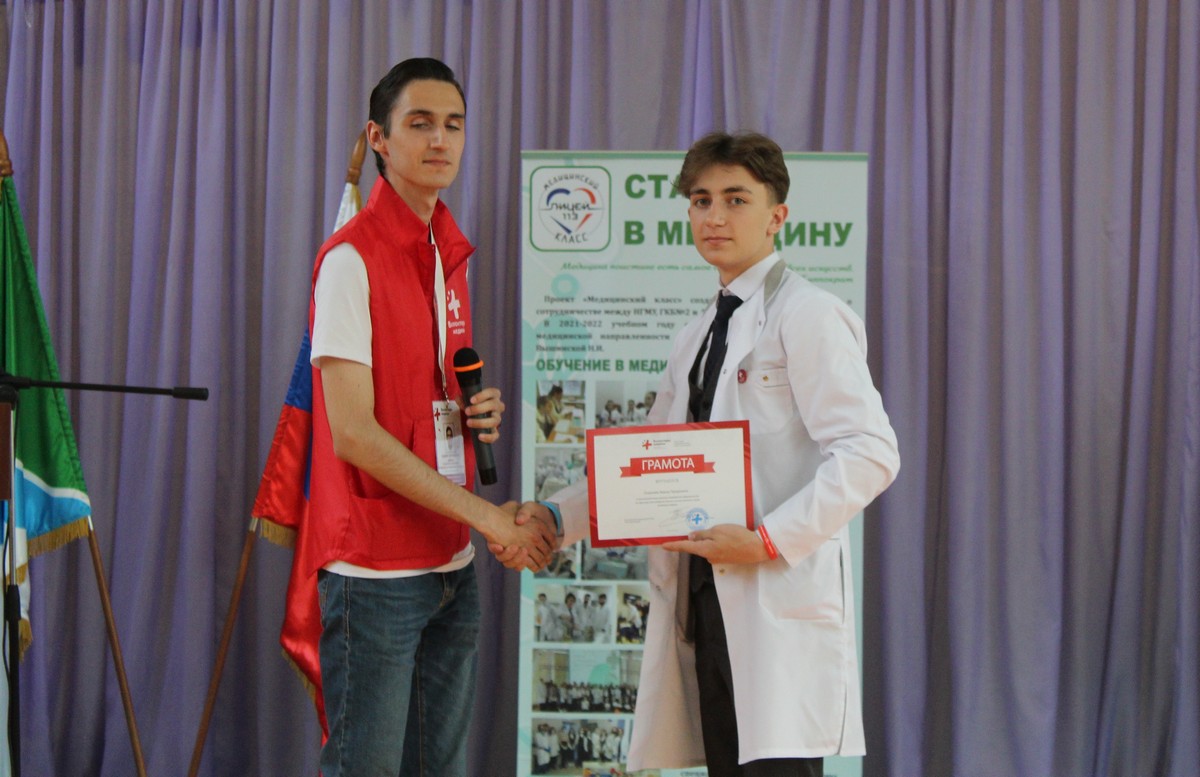 Вадим Евгеньевич Дернов, координатор направления «Профориентация школьников в медицину» Регионального отделения Новосибирской области Всероссийского общественного движения «Волонтеры-медики» осветил деятельность волонтерского отряда МБОУ Лицей №113 и наградил самых активных волонтеров грамотами.