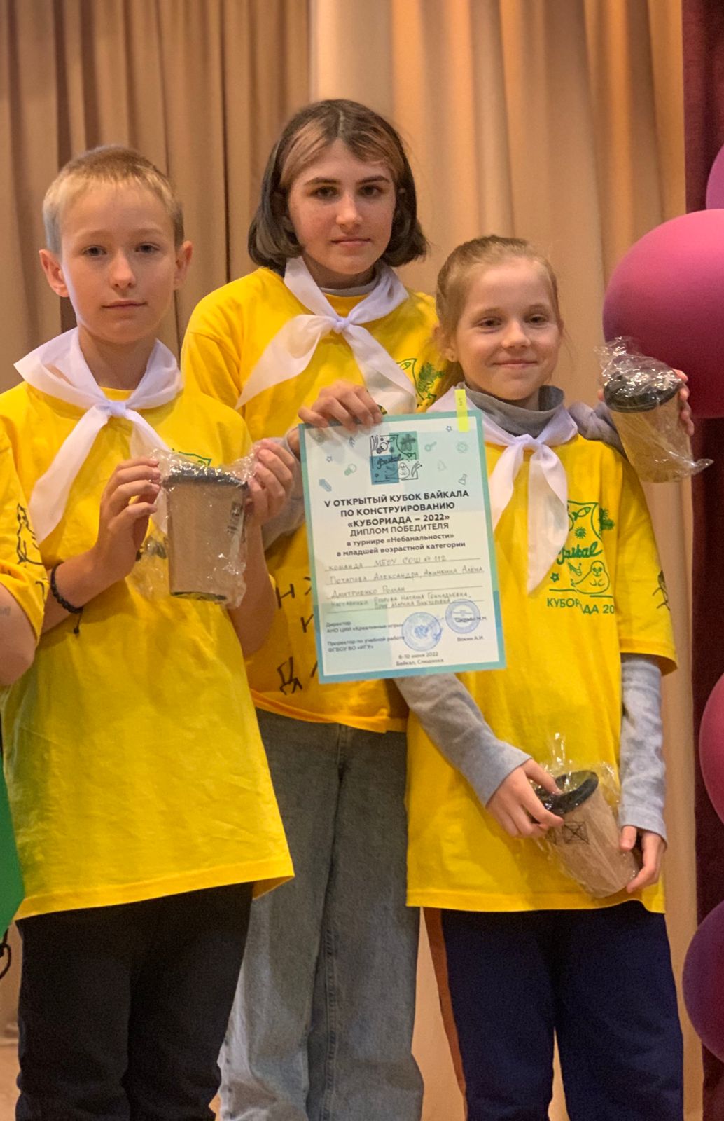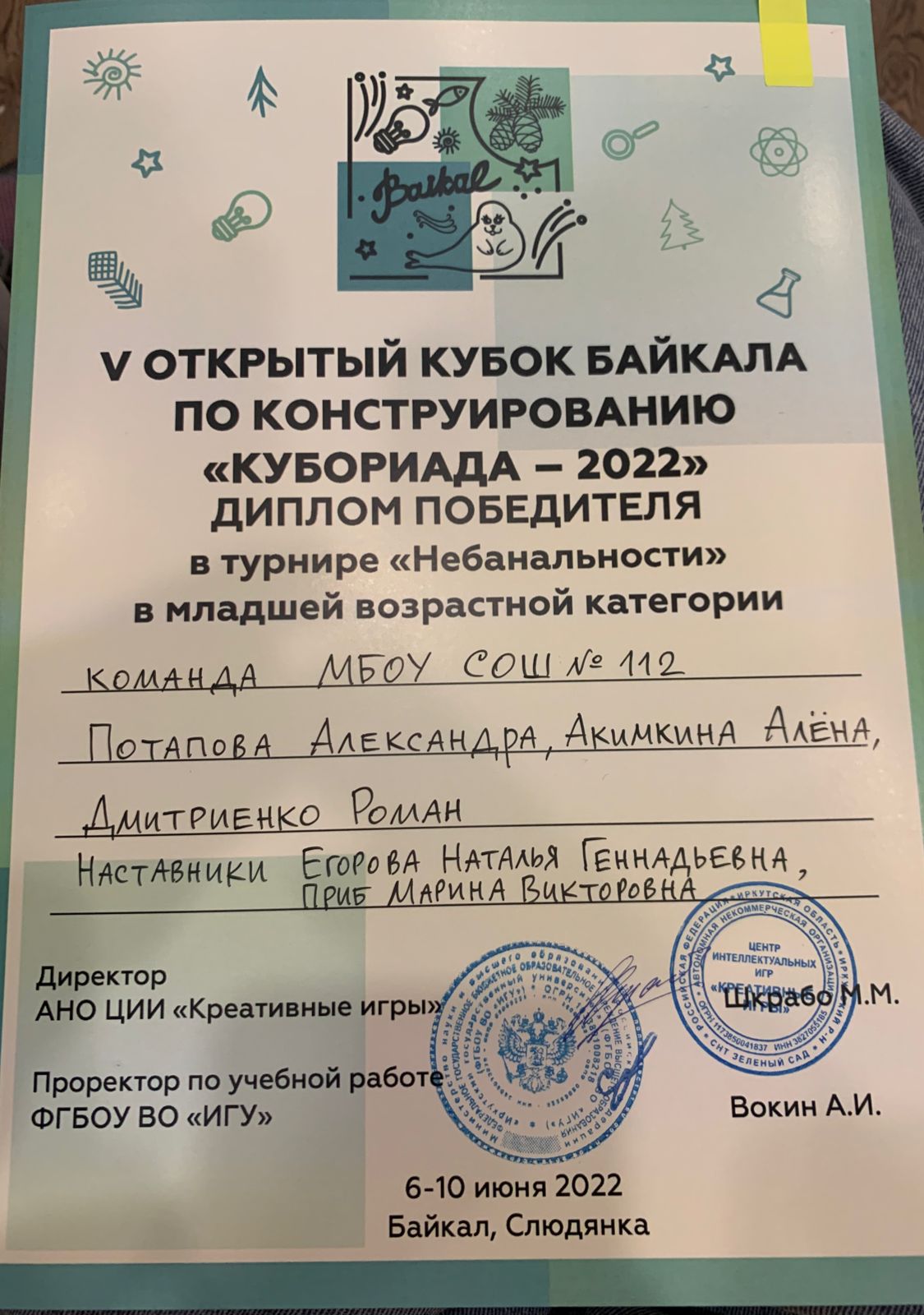 В турнире «Небанальности» в младшей возрастной категории команда школы № 112 (Потапова Александра, 4 «А» класс; Акимкина Алена, 3 «Б» класс; Дмитриенко Роман, 3 «Б» класс) стала победителем. Также команда стала призером V открытого кубка Байкала по конструированию «Кубориада-2022». Наставниками команд являются учителя начальных классов Егорова Н. Г. и Приб М. В.