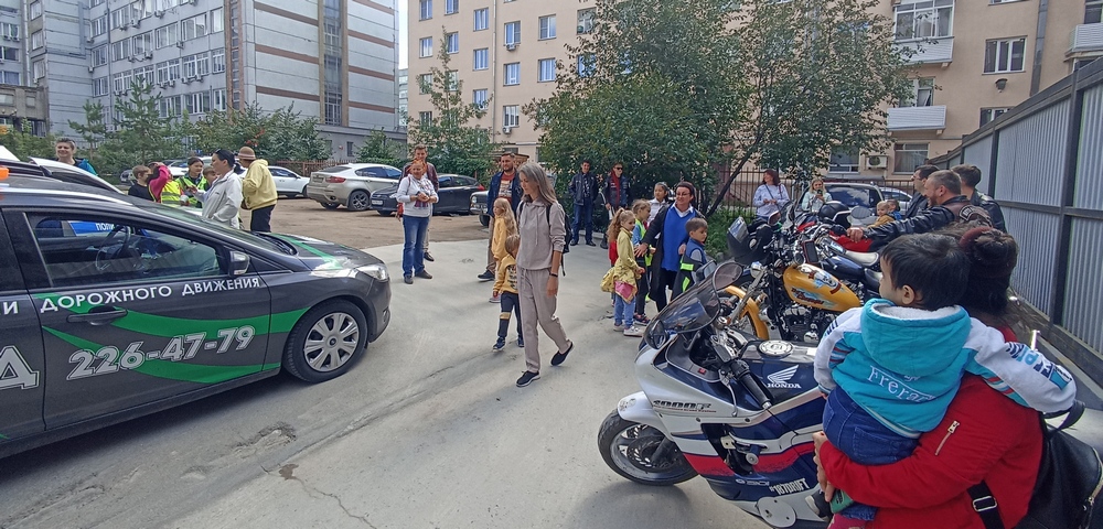 Огромная фотозона образовалась во дворе дома. Мотоциклисты пригнали своих железных коней. Жители двора фотографировались на мотоциклах, а малыши увлеченно лазали по ним. Каждый желающий смог подойти поближе и узнать всё про байки, мотоциклы и т.д. Дети смотрели восторженно на экипировку мотоциклистов. Некоторые примерили на себя мотошлем. Представители мотоклуба «Мото-Братство-Новосибирск» рассказали о том, как необходимо быть внимательным на дороге, управляя двухколесным транспортным средством. Среди них также присутствовали свободные мотоциклисты, которые обратили внимание детей на то, какие существуют правила для мототранспорта.
