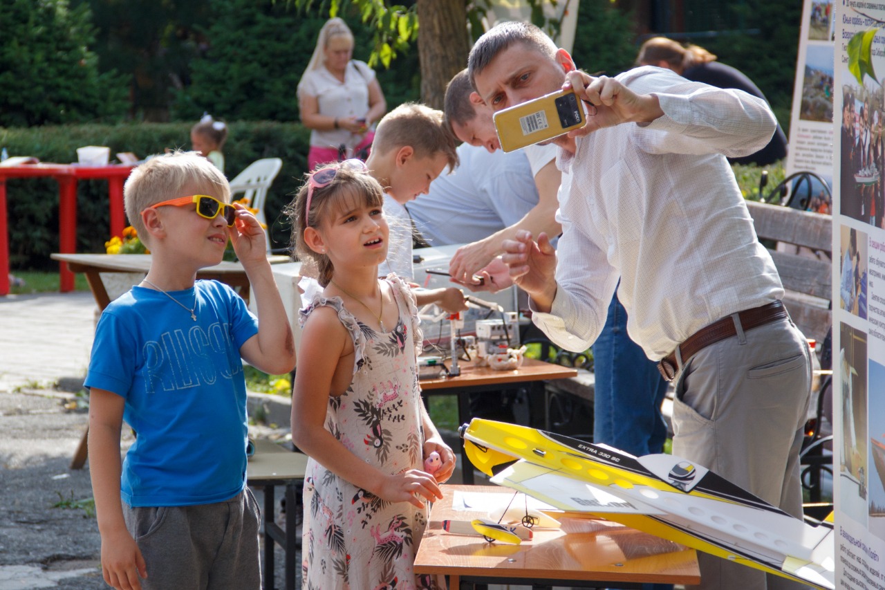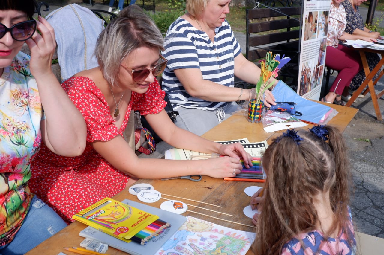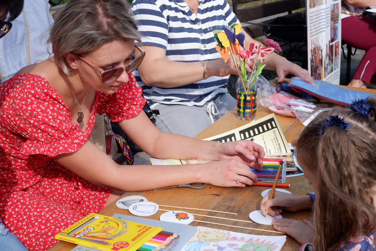 Около центральной клумбы Дом творчества организовал творческие мастерские под летним названием «Солнце в оконце». Свои модели кораблей представил А.В. Курбатов, макеты самолетов – Д.А. Овчинников, технические испытания роботов продемонстрировал М.А. Германов, конкурс рисунков на асфальте провела М.С. Комарова, выставка макетов ландшафтного дизайна прошла под руководством Л.Е. Шевцовой. Р.М. Новокрещенова и Т.А. Адресова подготовили для ребят экоопыты с микроскопом и экологическую викторину. А.Н. Коченова рассказала о важности финансовой грамоты для подростков и провела интерактив со всеми желающими. Одним из популярных мастер-классов стал аквагрим под руководством В.П. Савинцевой и Е.И. Житенко. С.А. Яковлева и Л.А. Огнева организовали для гостей праздника мастер-классы по декоративно-прикладному творчеству, педагоги Центра развития дошкольников «Тимошка» рассказали о работе своего центра и поиграли с ребятами в различные спортивные игры. А гости праздника все вместе создали один большой портрет медвежонка Тимошки. И.О. Миронова провела выставку фоторабот и мастер-класс по фотографии.