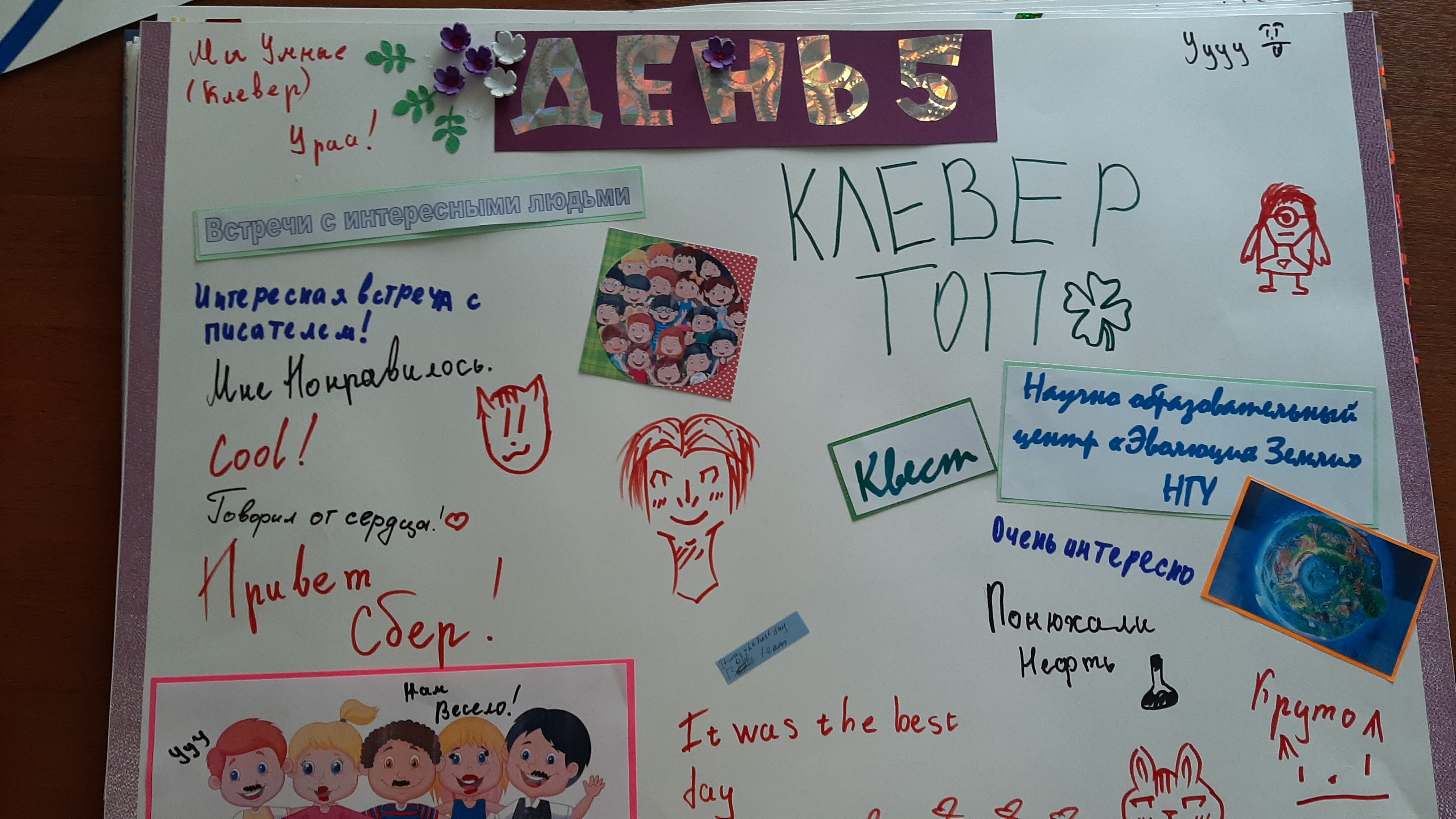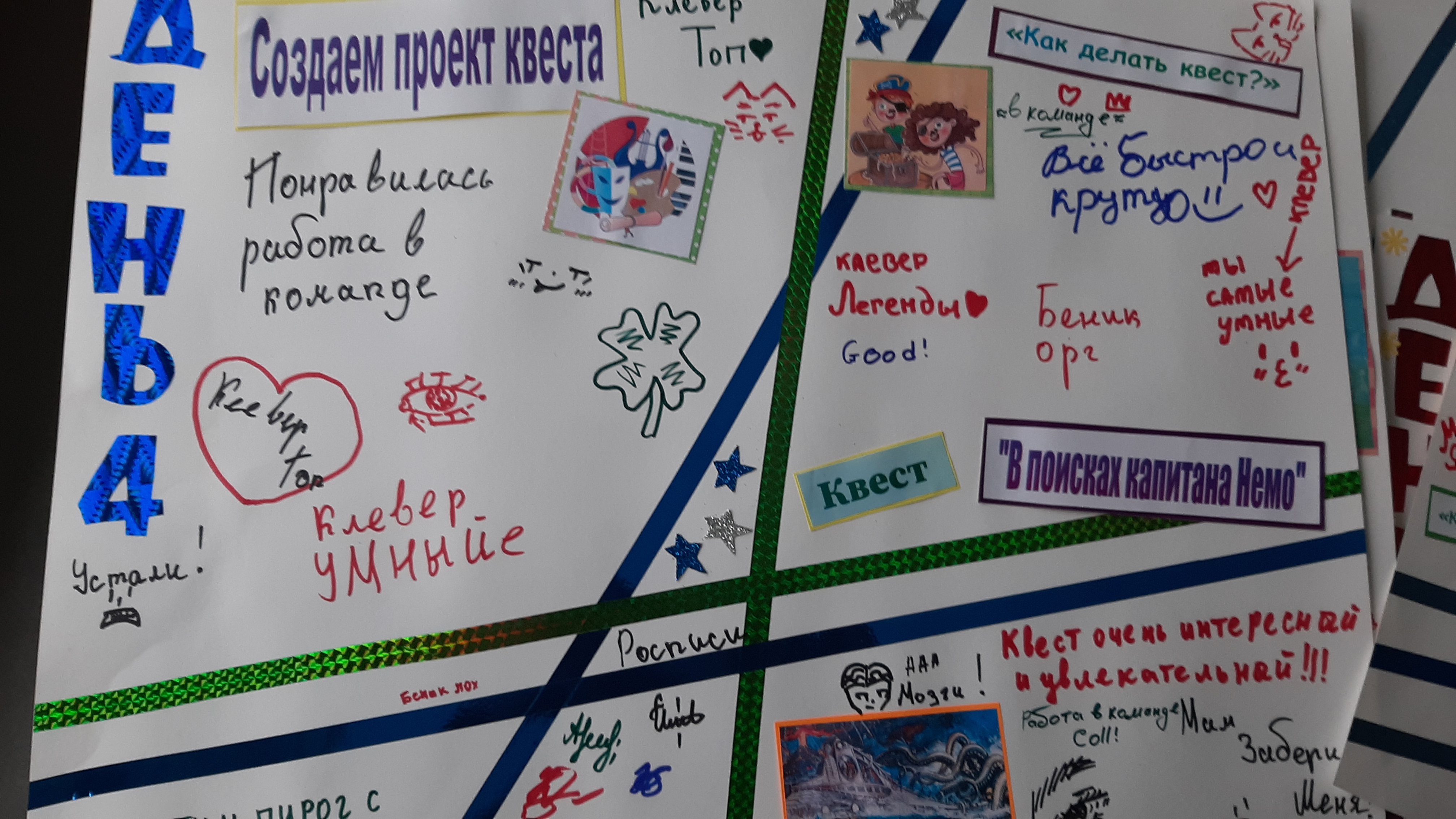 В одной классной комнате ребята познакомились со структурой образовательного и литературно-познавательного квеста, сделали его макеты, а в другой аудитории, собирая спилс-карты, знакомились с районами Новосибирской области. Это было подготовкой к проведению в последующем квеста, посвященного предстоящему празднованию ее 85-летия. Затем участники смены поменялись задачами и деятельностью, поэтому все были охвачены программой данного дня.