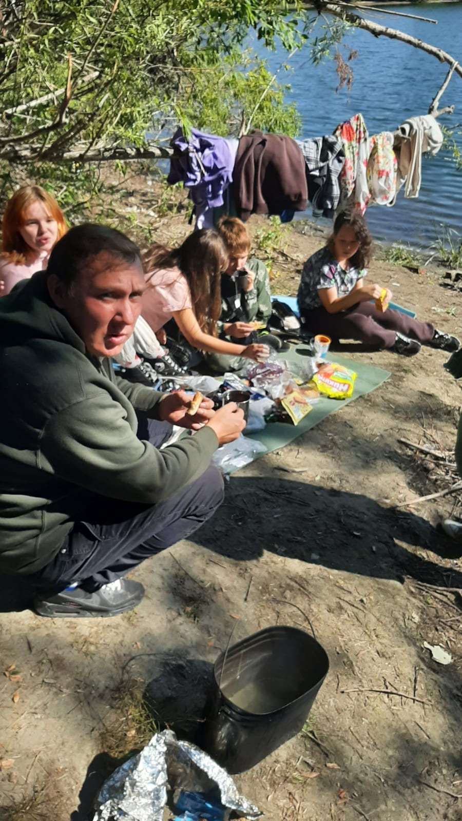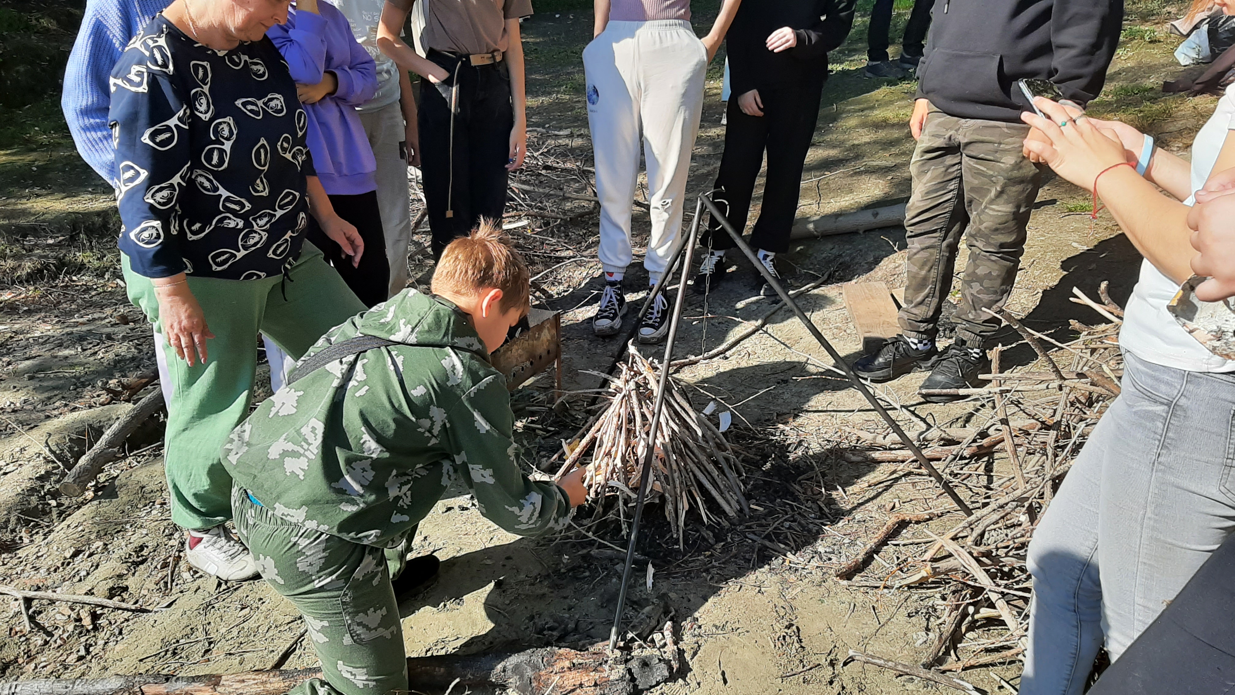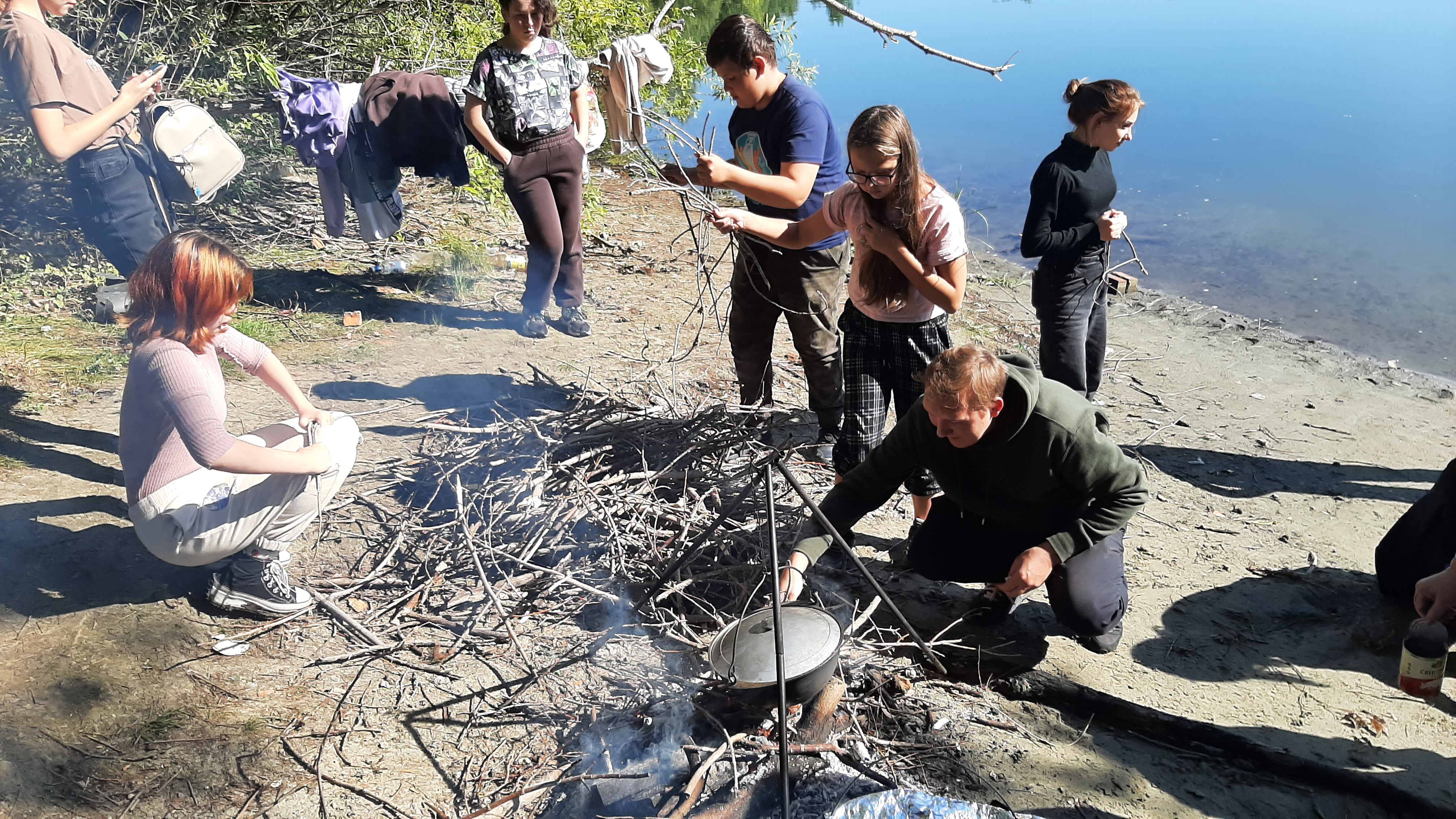 Преодолев все препятствия, ребята наконец увидели озеро и, как будто совсем не устали, – дружно стали собирать хворост для костра. В походе важно все, но особенно – традиции и ритуалы: установка рогатины для котелка, разжигание костра, дежурство у огня, чтобы не затух… Какие нужные навыки для жизни!