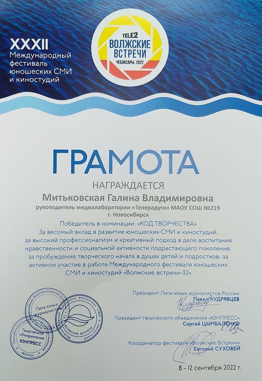Медиалаборатория «Телерадуга» МАОУ СОШ № 219 – победитель Международного фестиваля «Волжские встречи-32»