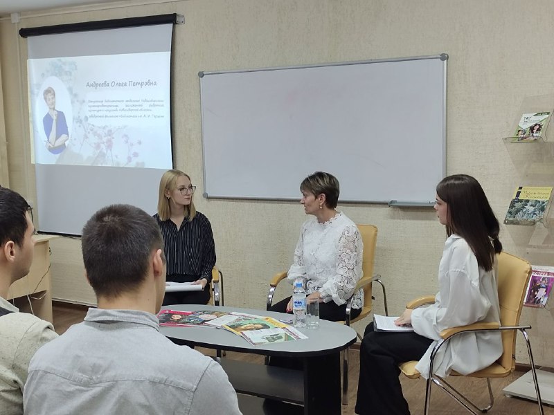 Студенты отделения с интересом включились в диалог, и выяснилось, что среди любимых писателей Ольга Петровна называет новосибирских прозаиков Петра Дедова, Михаила Щукина, Игоря Кожухова, также будущие библиотекари заинтересовались романом Гузель Яхиной «Эшелон на Самарканд», о котором рассказывала Ольга Петровна. Интересный факт: самым нелюбимым предметом нашей гостьи было библиографоведение, хотя преподавателя этого предмета Шигаеву Т. Г. она до сих пор вспоминает, как образец элегантности и стиля. Студенты выяснили, что в своей профессии Ольге Петровне больше всего нравится работать с людьми, беседовать о книгах и проводить мероприятия. Она надеется, что книги и в будущем останутся основой библиотеки. Студентам гостья пожелала успехов в учебе и будущей карьере, а также понимания ценности будущей профессии.