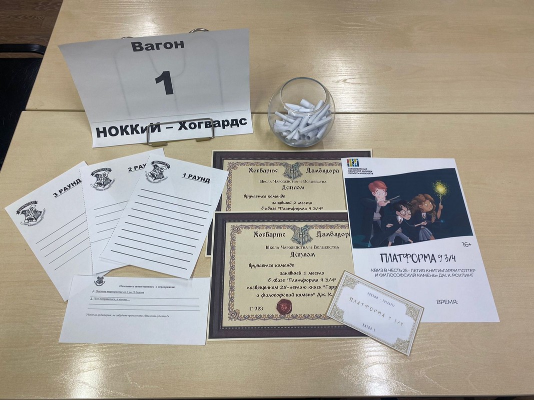 В честь юбилея книги студенты 3-го курса библиотечно-информационного отделения Новосибирского областного колледжа культуры и искусств провели квиз «Платформа 9 ¾». Он был организован для студентов первого курса и собрал 2 команды: «Магглы» и «Снич(т)». Игра состояла из четырех раундов: «Разминка для везучих», «Видеовопрос», «Фотовопрос», «Встреча с магическим шаром». Все вопросы раундов были связаны с серией книг и фильмов о Гарри Поттере. Ответы по каждому вопросу игроки вносили в бланки, которые в конце каждого раунда собирал наблюдатель. В первом раунде участникам было предложено 10 вопросов и к каждому вопросу 4 варианта ответа, на обсуждение было отведено 30 секунд. Во втором раунде студентов ожидали 5 видеовопросов, которые содержали в себе фрагменты фильмов о Гарри Поттере. Третий раунд «Фотовопросы» был не менее увлекательным и позволил вспомнить даже второстепенных героев «поттерианы». Ребята с большим энтузиазмом справились с заданиями.