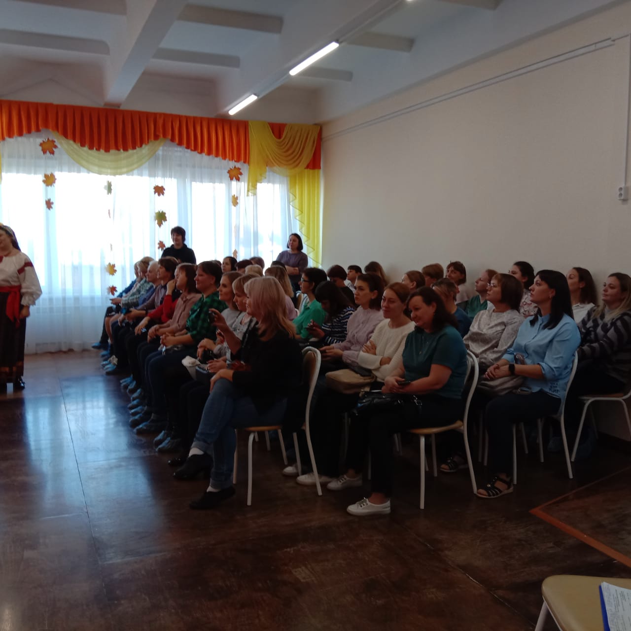 С приветственным словом к участникам итогового мероприятия обратилась Теплякова Мария Сергеевна, заведующий МКДОУ д/с № 465. В своем выступлении она отметила, что в детском саду для детей старшего дошкольного возраста в октябре проводится «Осенняя ярмарка» в традициях русского народа. В рамках проекта воспитанники детского сада знакомятся с особенностями русского народного костюма, быта, с народным календарем, с русскими фольклорными праздниками «Осенины», с традиционными ремеслами русского народа, с малыми формами устного народного творчества (загадки, потешки, песенки), с играми, хороводами и плясками.