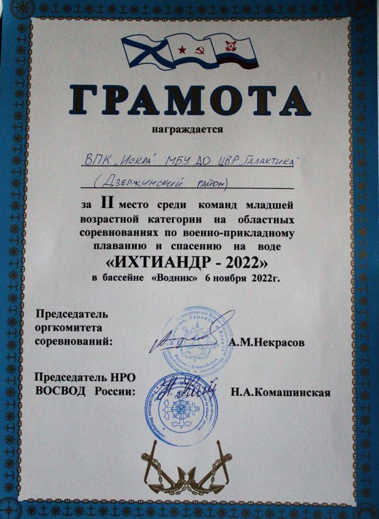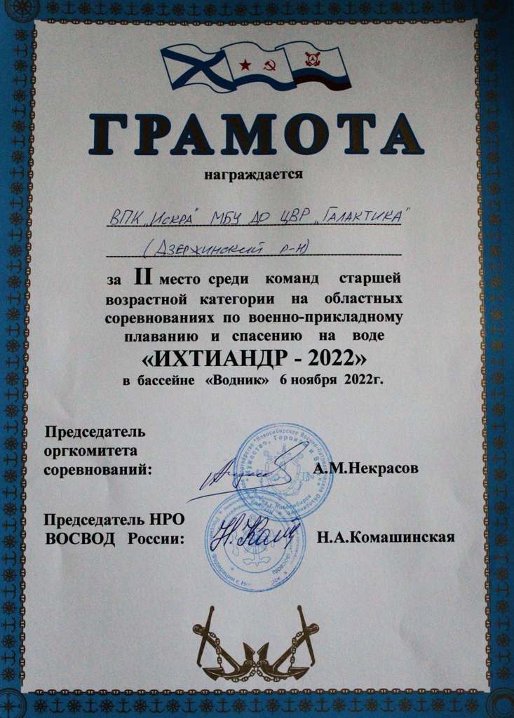 Три сборных команды курсантов военно-патриотического клуба «Искра» представляли ЦВР «Галактика» на Областных соревнованиях по военно-прикладному плаванию и спасению на воде «Ихтиантдр-2022». Соревнования прошли 6 ноября на базе бассейна «Водник» при поддержке НВПО «Мужество, Героизм и Воля!», НРО ДОСААФ России и Всероссийского общества спасания на водах (ВОСВОД России). Соревновались три возрастные группы: младшая (12-13 лет), средняя (14-15 лет) и старшая (16-17 лет). Участников ждали 3 упражнения: