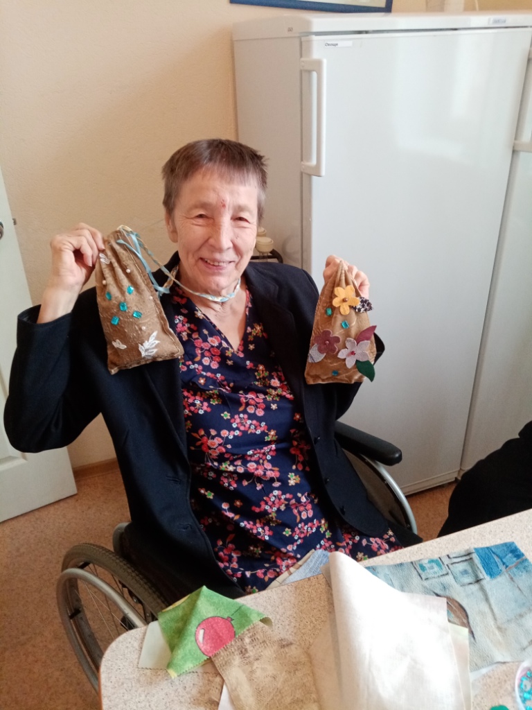 Люди пожилые, есть проблемы со зрением, руками. Но сколько в них интереса и желания узнать и создавать что-то новое! С помощью педагогов ветераны сделали свои кисеты и украсили их. Наши изделия очень пригодятся ветеранам: ведь в кисетах можно хранить сотовые телефоны, небольшие предметы. А мы в свою очередь в качестве небольшого сувенира в каждый кисет положили конфеты.