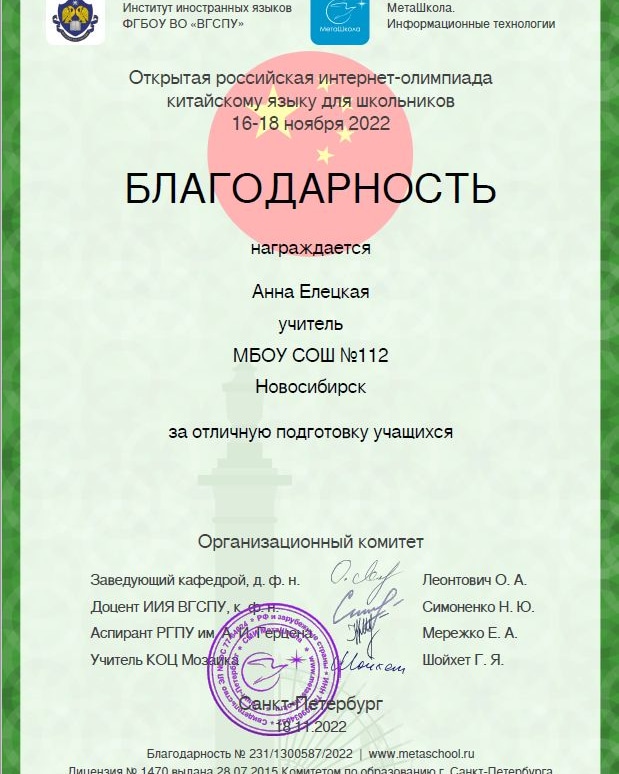 Поздравляем преподавателя внеурочной деятельности по китайскому языку Елецкую Анну Сергеевну, учителя китайского языка Заставенко Александру Михайловну и победителей Всероссийского конкурса по китайскому языку – учащихся 6 «А» класса школы № 112: